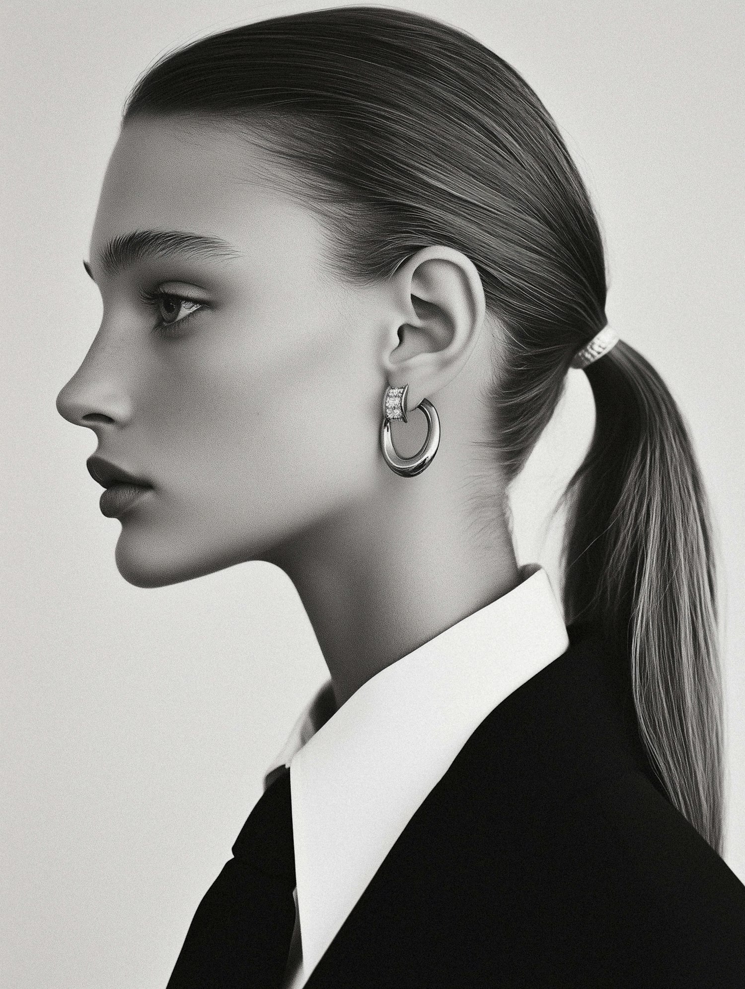 Elegant black and white portrait of a woman in formal attire, showcasing sleek hair and sophisticated jewelry.