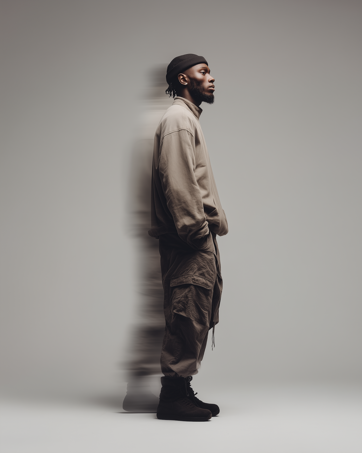Stylish man in beige cargo outfit and black beanie, standing in profile with motion blur effect on a minimalist gray background.