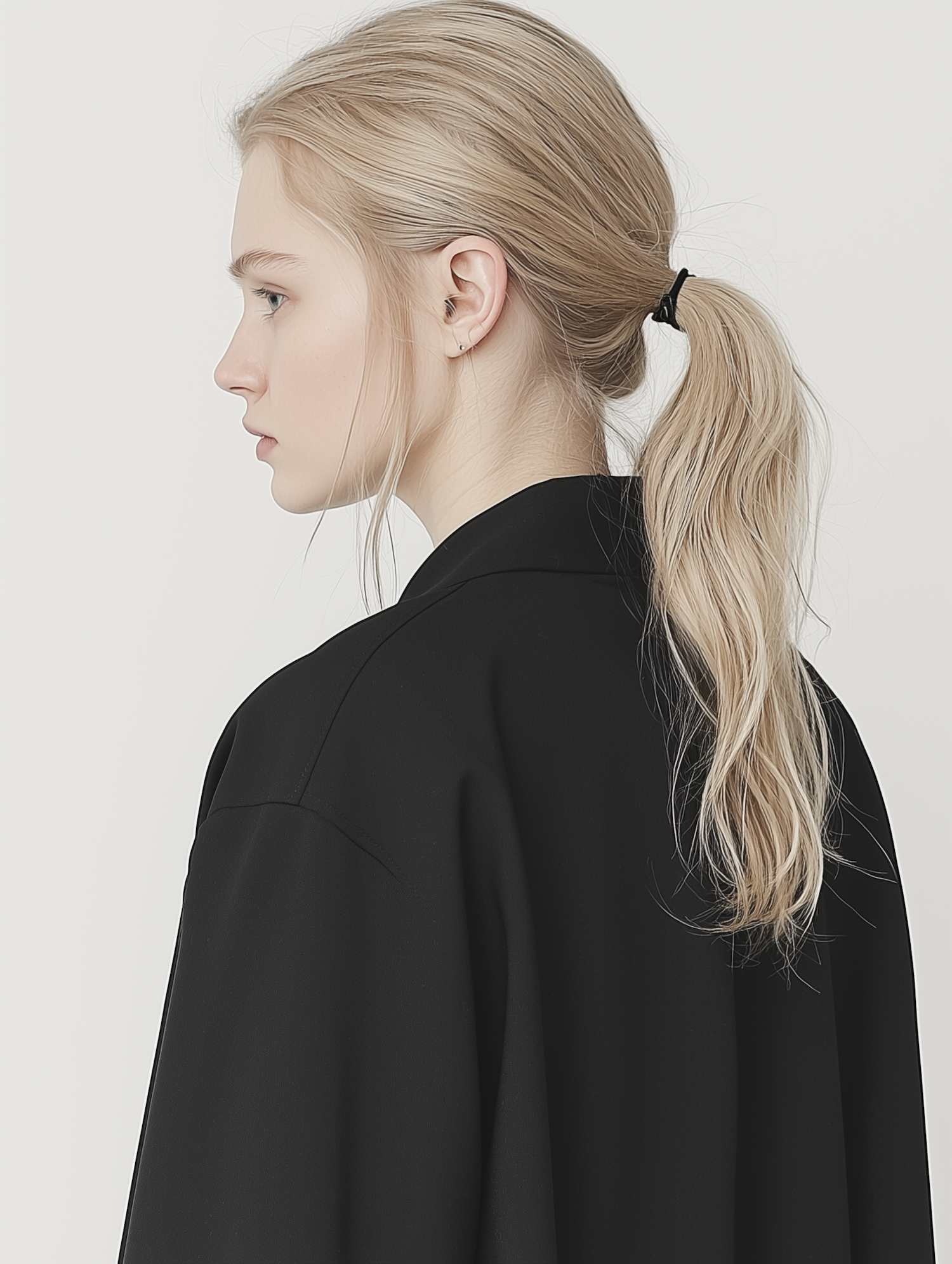 Profile of a young woman with blonde hair in a ponytail, wearing a black jacket against a light background.
