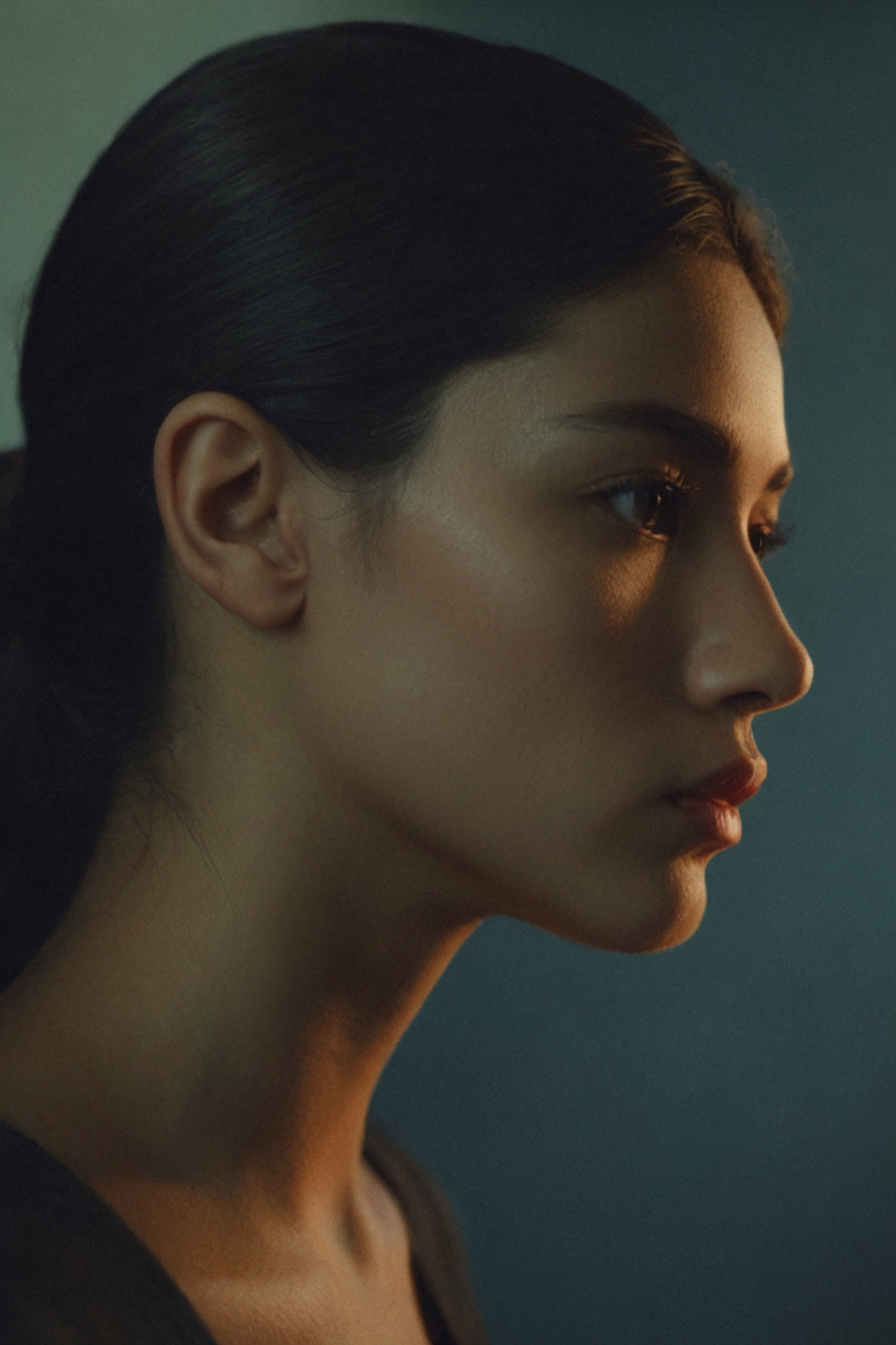 Profile portrait of a woman lit by soft lighting with warm and cool tones, creating a reflective and artistic atmosphere.