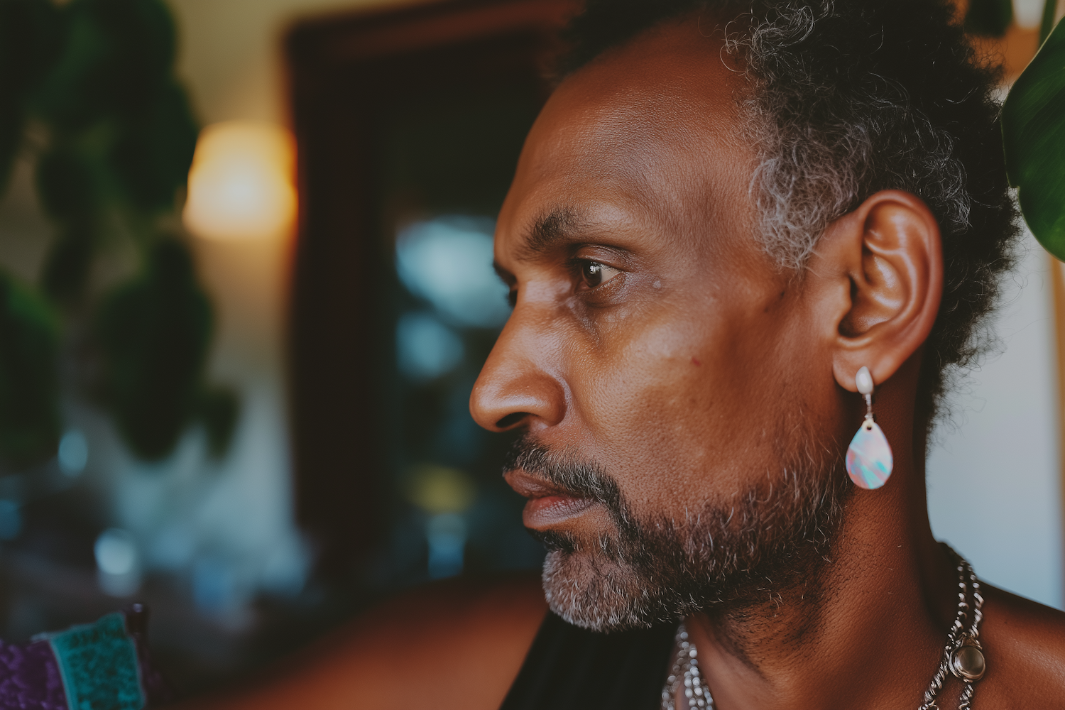 Profile portrait of a handsome older man with a pearlescent dangling earring and short graying hair in warm atmospheric lighting.