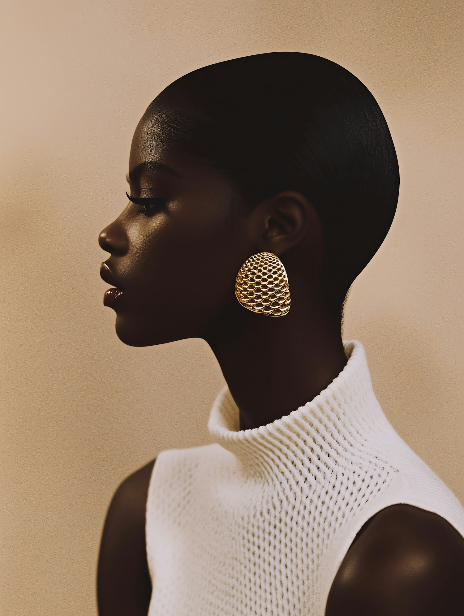 Elegant profile of a woman with sleek hair, gold earring, and white textured top against a beige background.