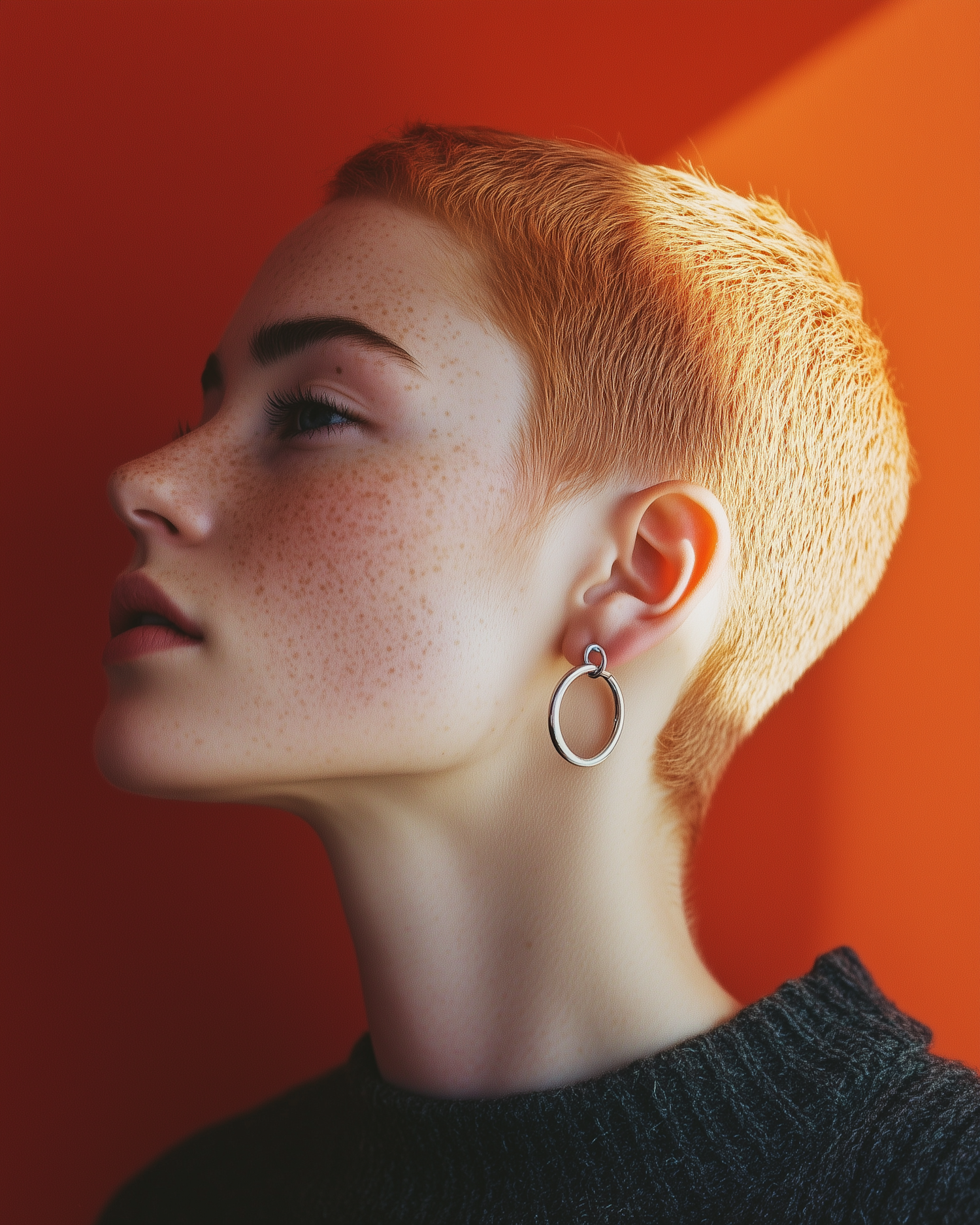 Profile of a young woman with short auburn hair and freckles, wearing a silver earring against a vibrant orange background.