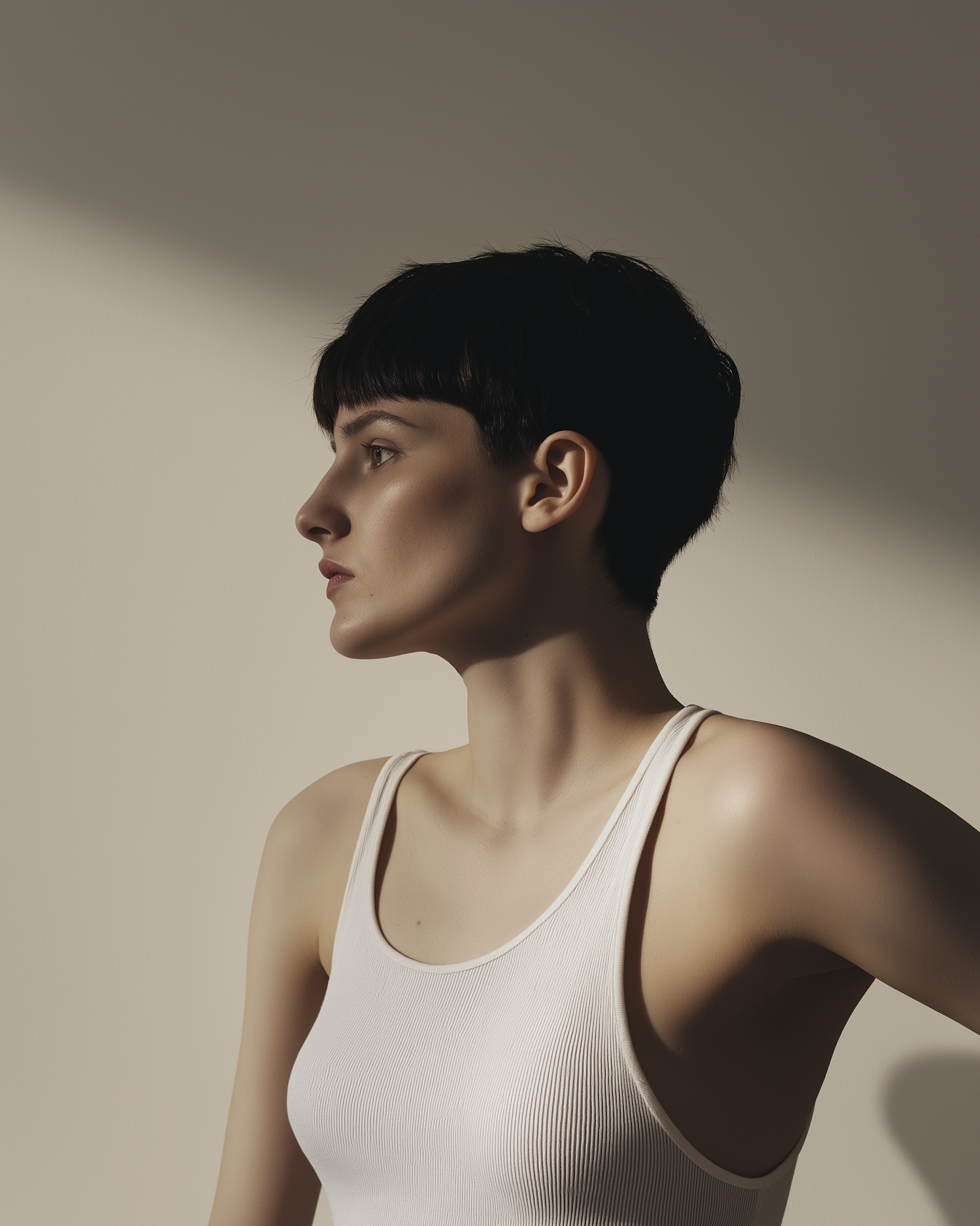 Profile of a person with short dark hair in soft lighting, wearing a white top. The serene, minimalist setting highlights their thoughtful expression.