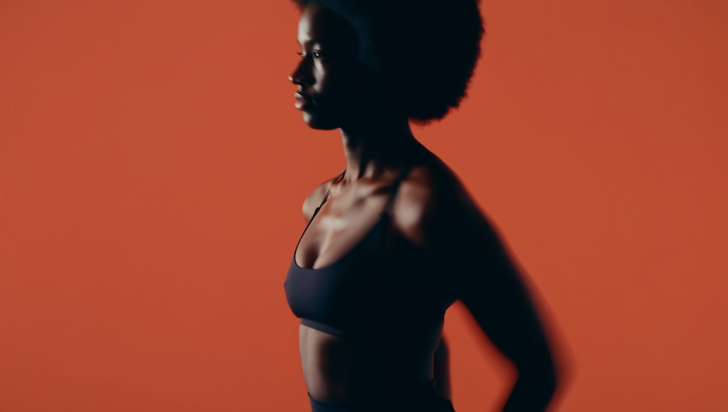 A profile view of a person with an afro hairstyle against an orange background, wearing a black sports bra, in a minimalistic composition.