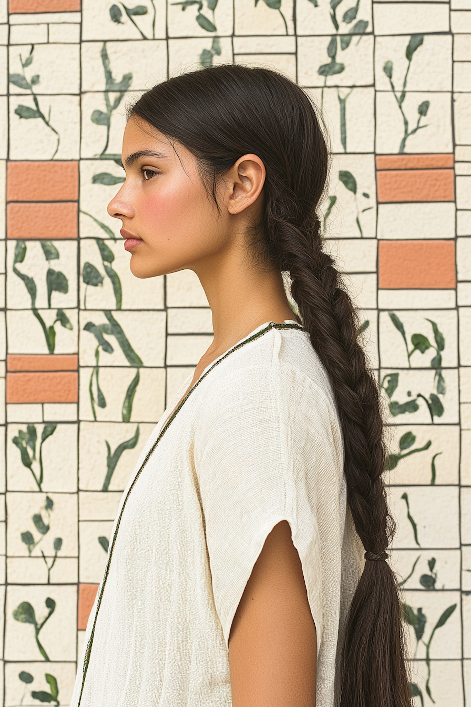Profile of a woman with a long braid, wearing a cream top, against a botanical tiled wall with green and orange accents.