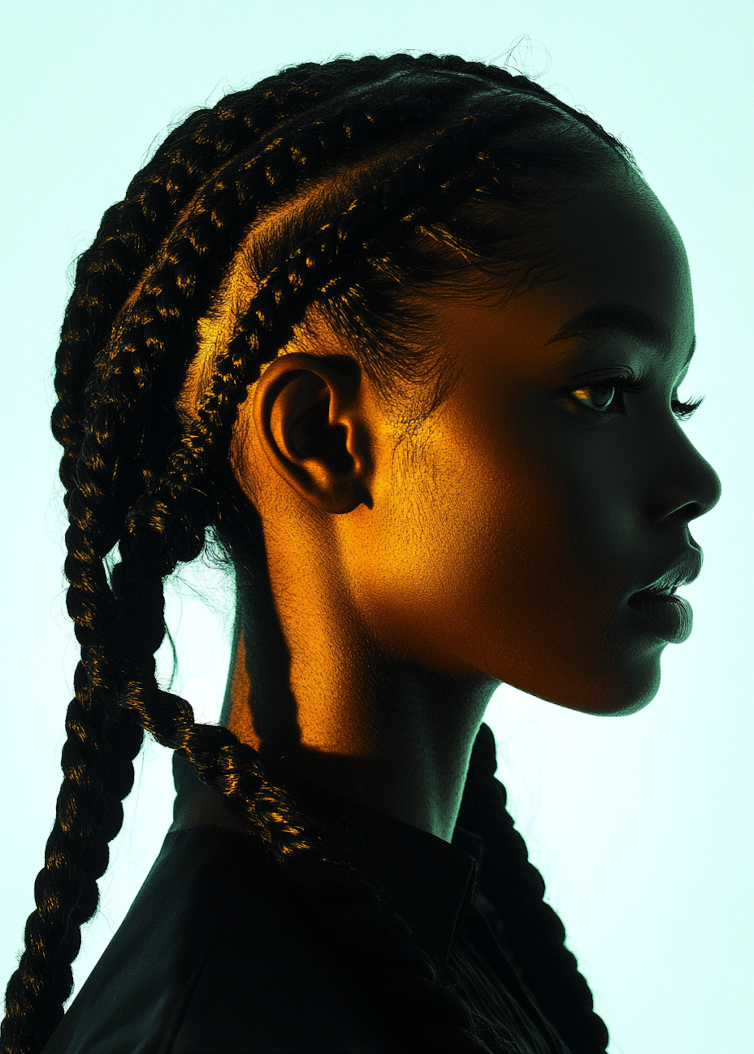 Profile of a young Black woman with braided hair, highlighted by warm lighting against a cool blue background.