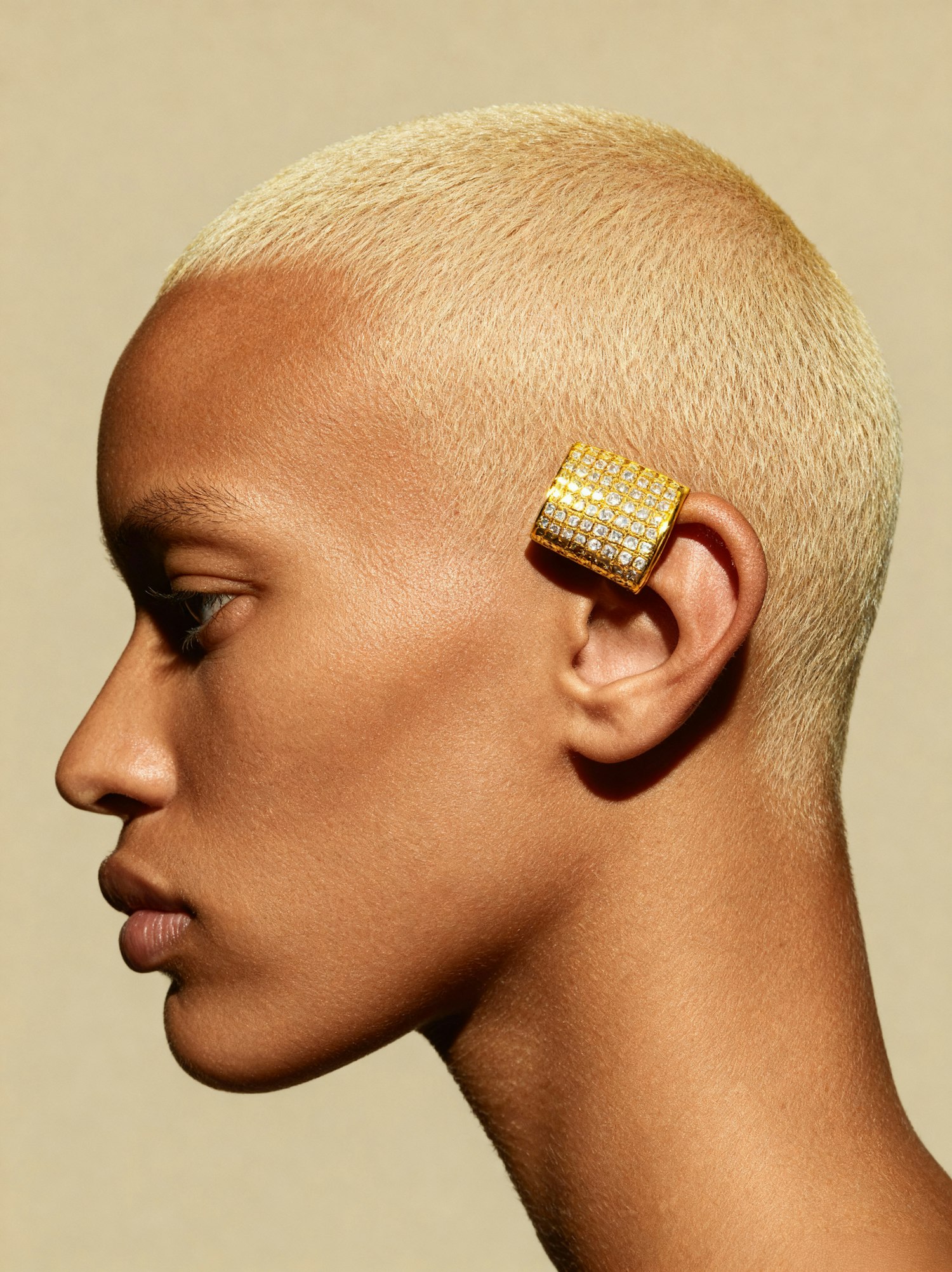 Close-up profile of a person with short blonde hair wearing a gold and diamond ear cuff, set against a neutral beige background.