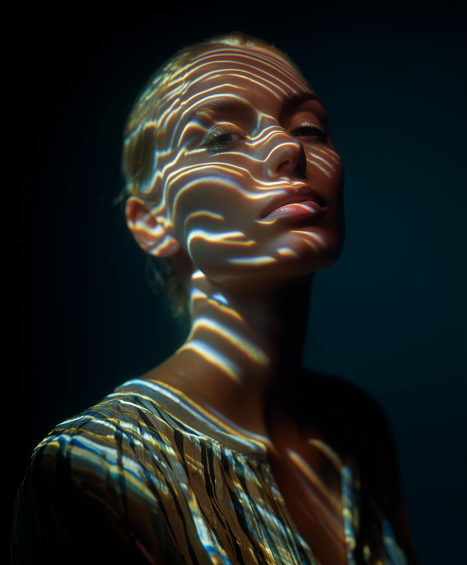 A striking portrait of a person with projected light patterns on their face, creating a dynamic and artistic visual effect.