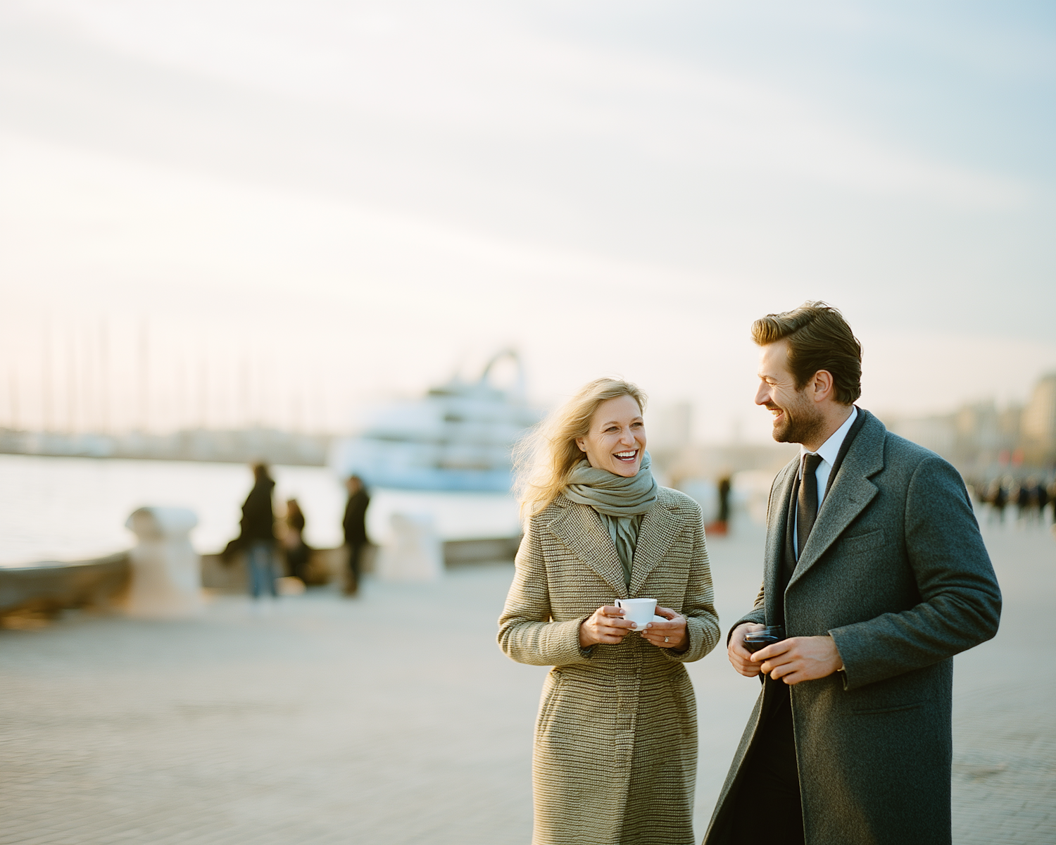 A cheerful couple enjoys a walk by the waterfront, holding drinks and chatting, with a yacht and a serene promenade in the background.
