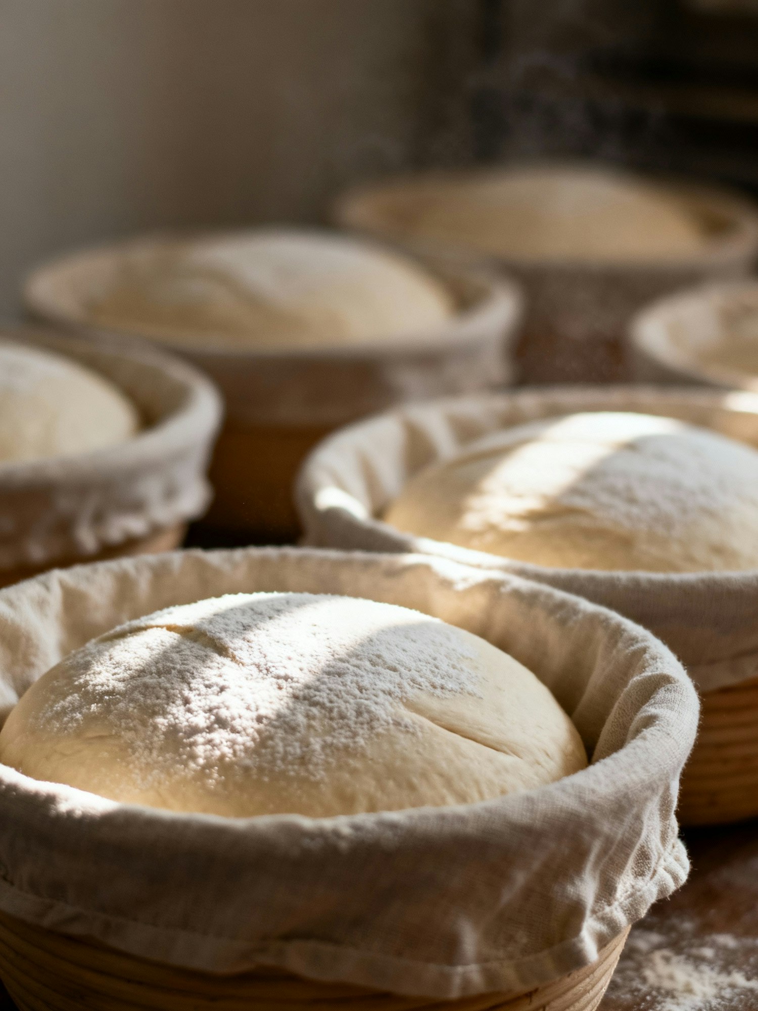 Freshly proofed dough in cloth-lined baskets, dusted with flour, illuminated by warm natural light, ready for baking.