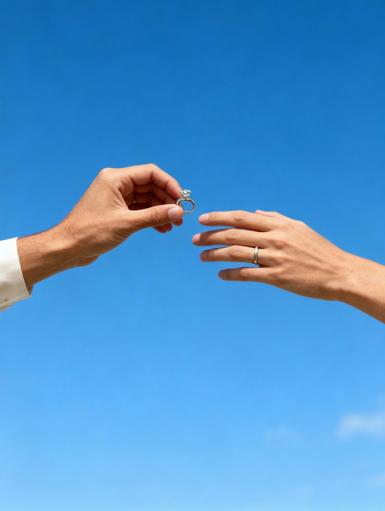 A close-up of hands exchanging a diamond ring against a clear blue sky, symbolizing love and commitment in a serene setting.