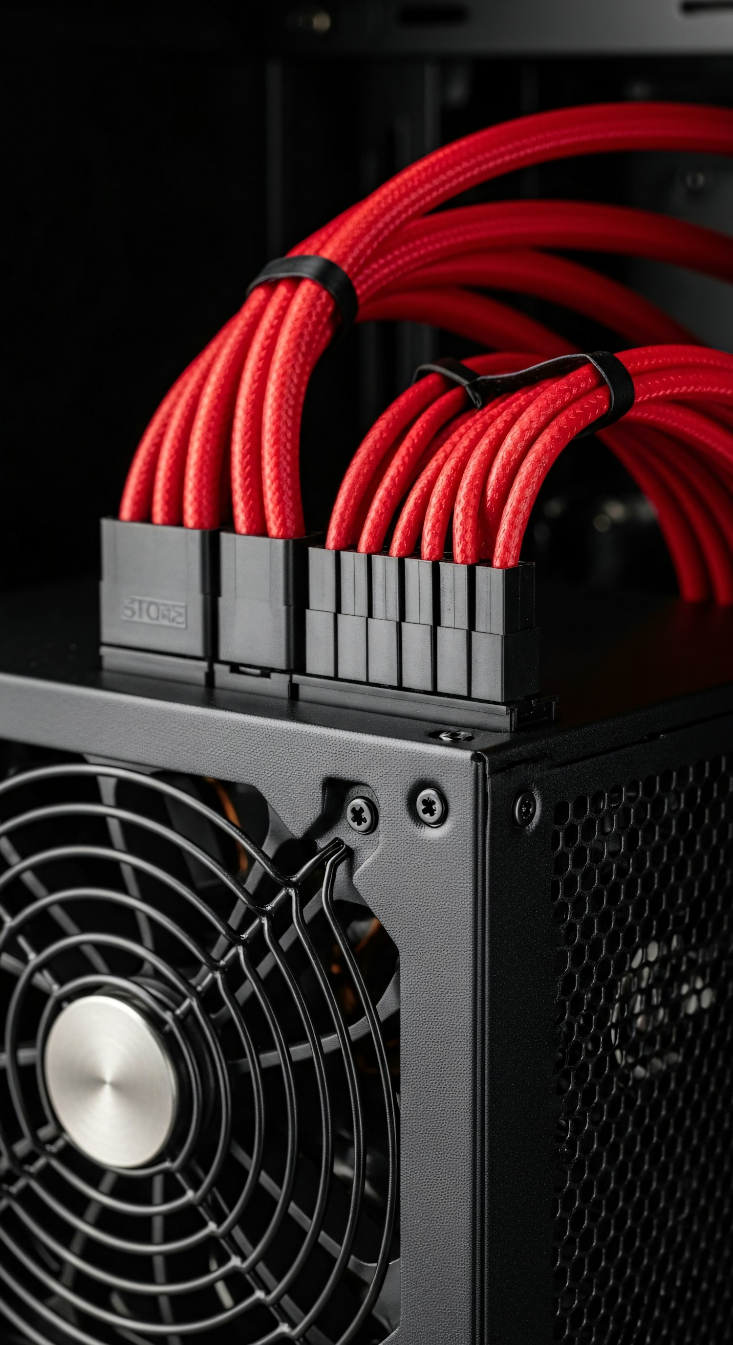 Close-up of a computer PSU with red sleeved cables and a black grille fan, showcasing clean cable management and modern design.
