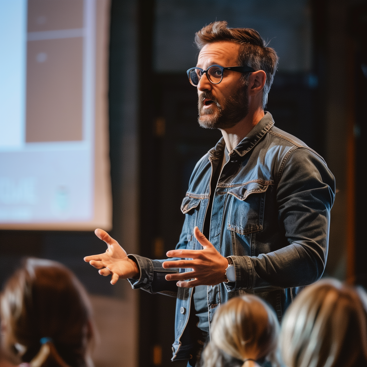 Caucasian man with beard and glasses giving a presentation, wearing a denim jacket, gesturing passionately in front of an audience.