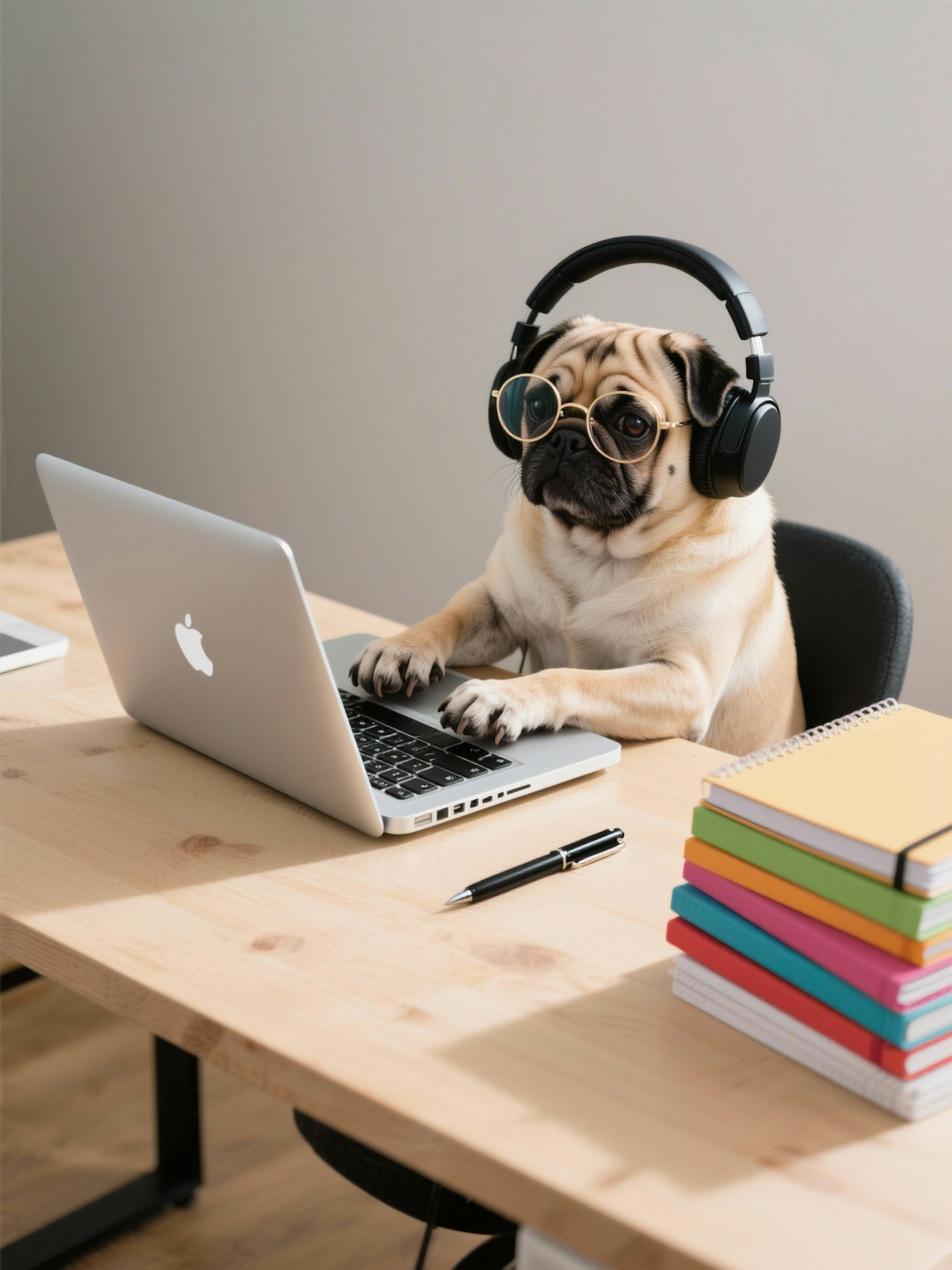 A pug wearing headphones and glasses sits at a desk with a laptop, surrounded by colorful notebooks and a pen, creating a humorous scene.