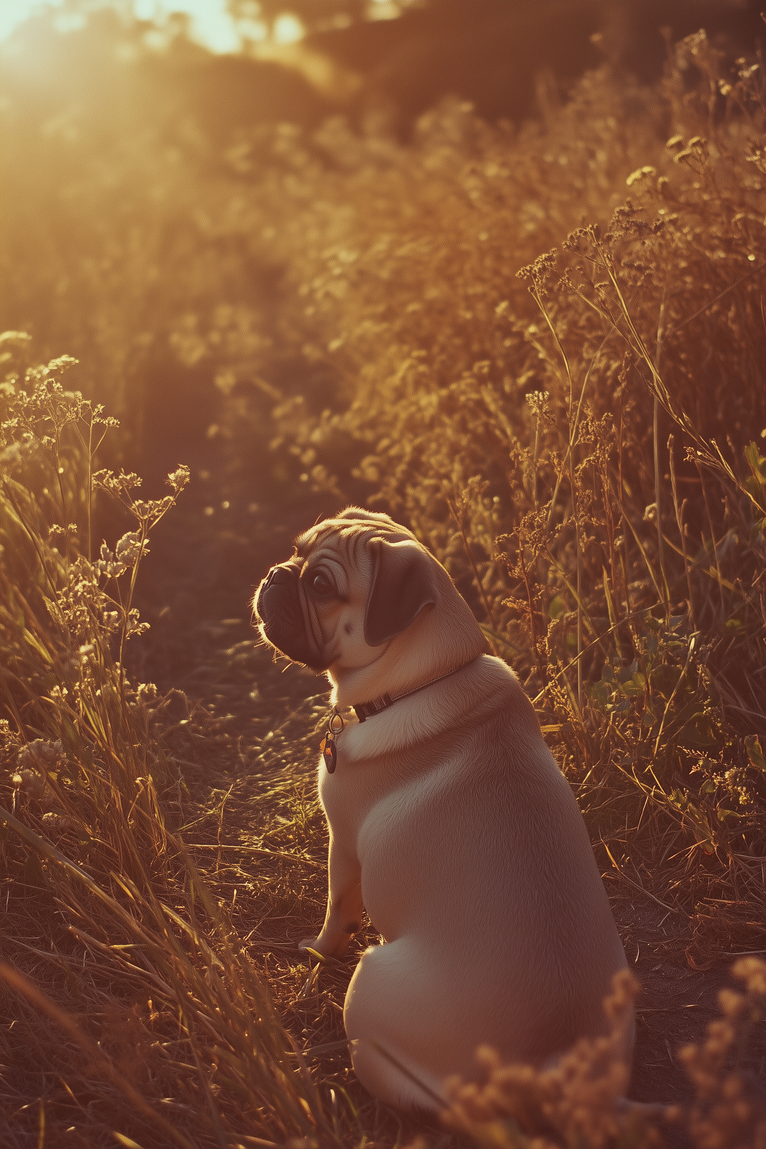 A pug sits in a sunlit field, surrounded by golden grass, creating a serene and warm atmosphere.