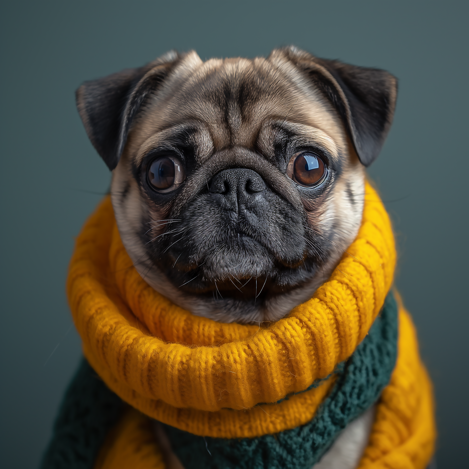 Adorable pug in a vibrant yellow and green knitted scarf against a teal background, showcasing its expressive eyes and cute features.