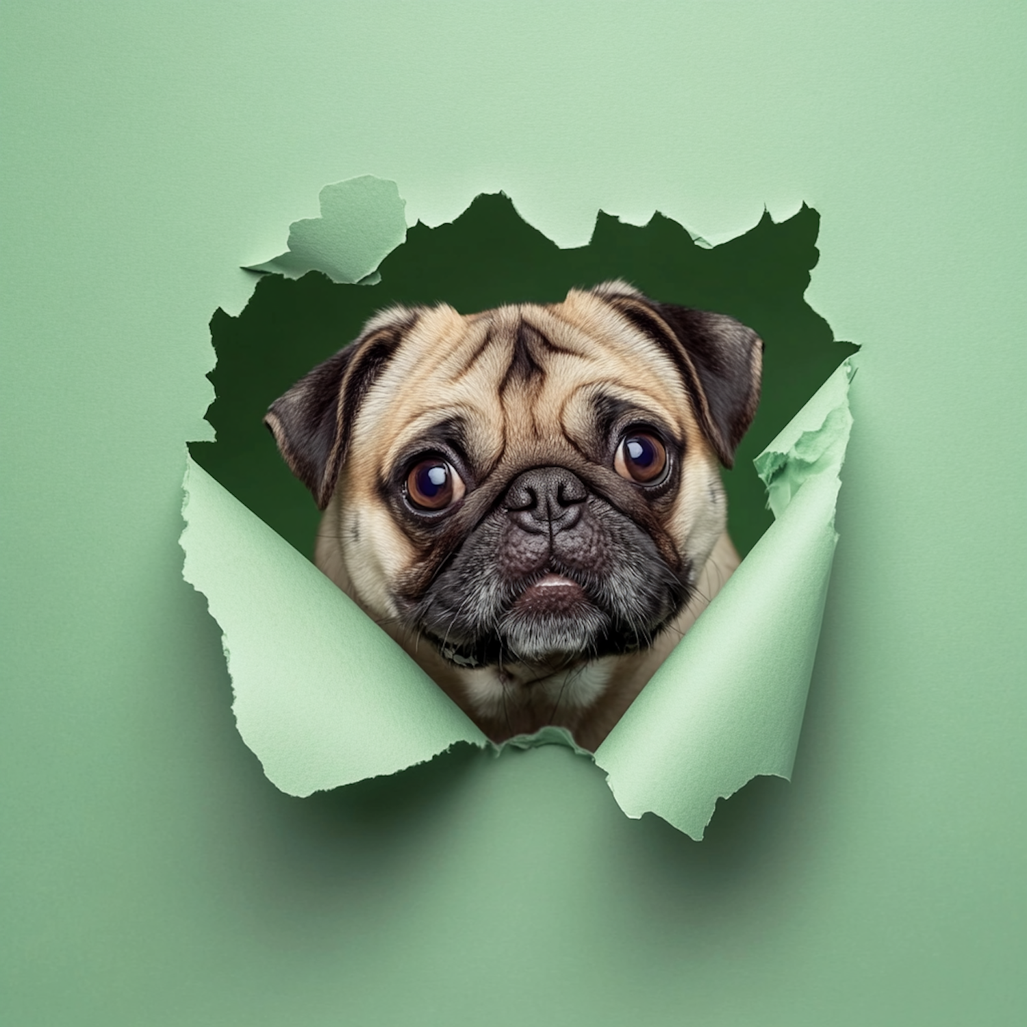 A curious pug peeks through a torn green paper, its expressive eyes and wrinkled face creating a charming focal point.