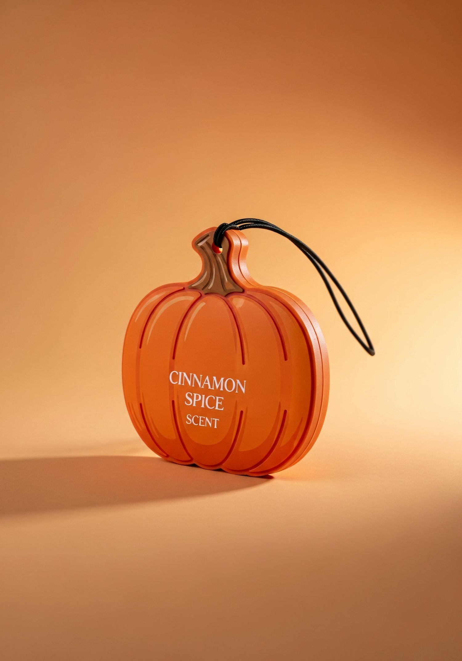 Pumpkin-shaped air freshener labeled 'Cinnamon Spice Scent' on a warm orange background, perfect for autumn-themed decor.