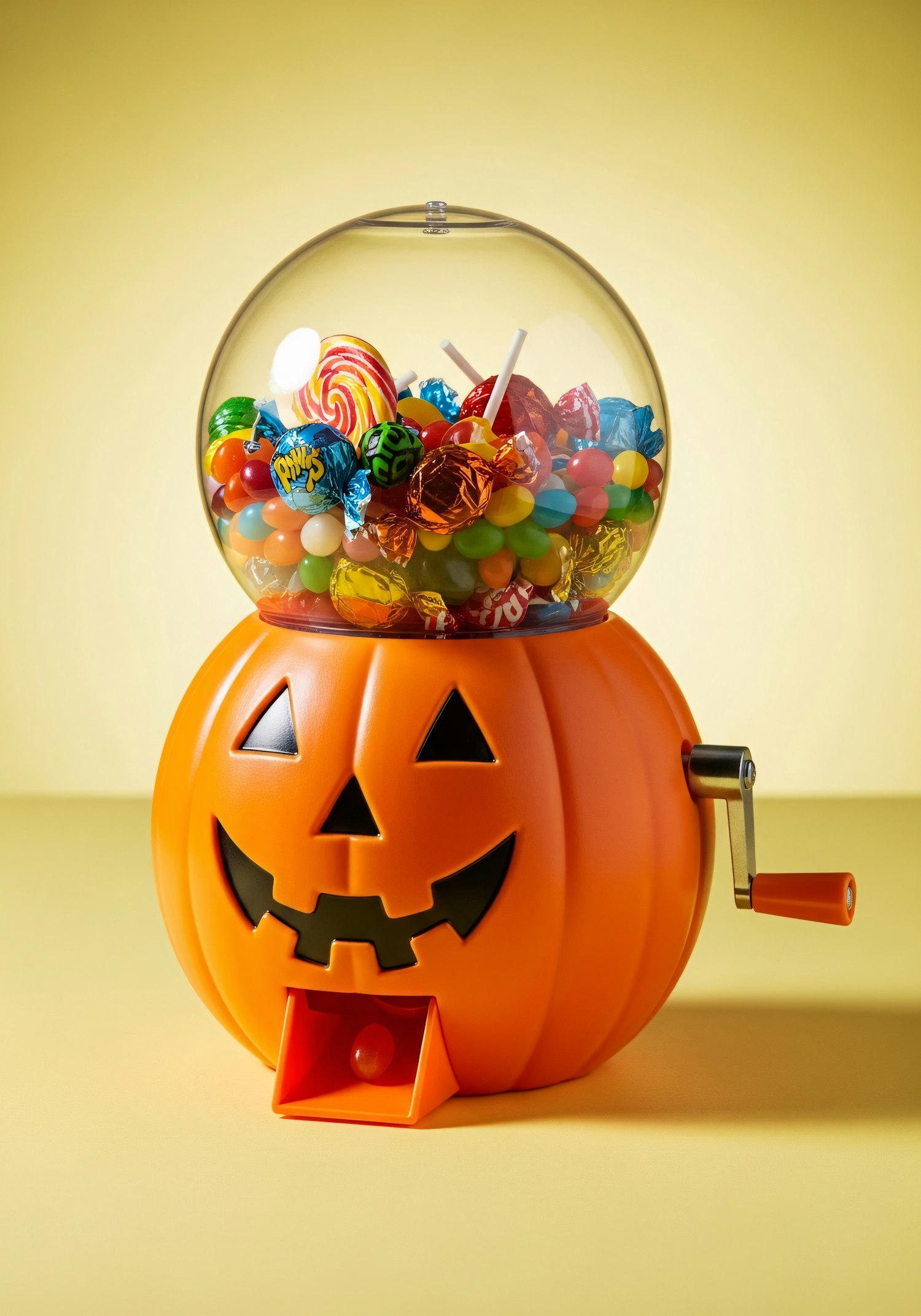 A pumpkin-shaped candy dispenser filled with colorful treats, perfect for Halloween celebrations or festive decor.