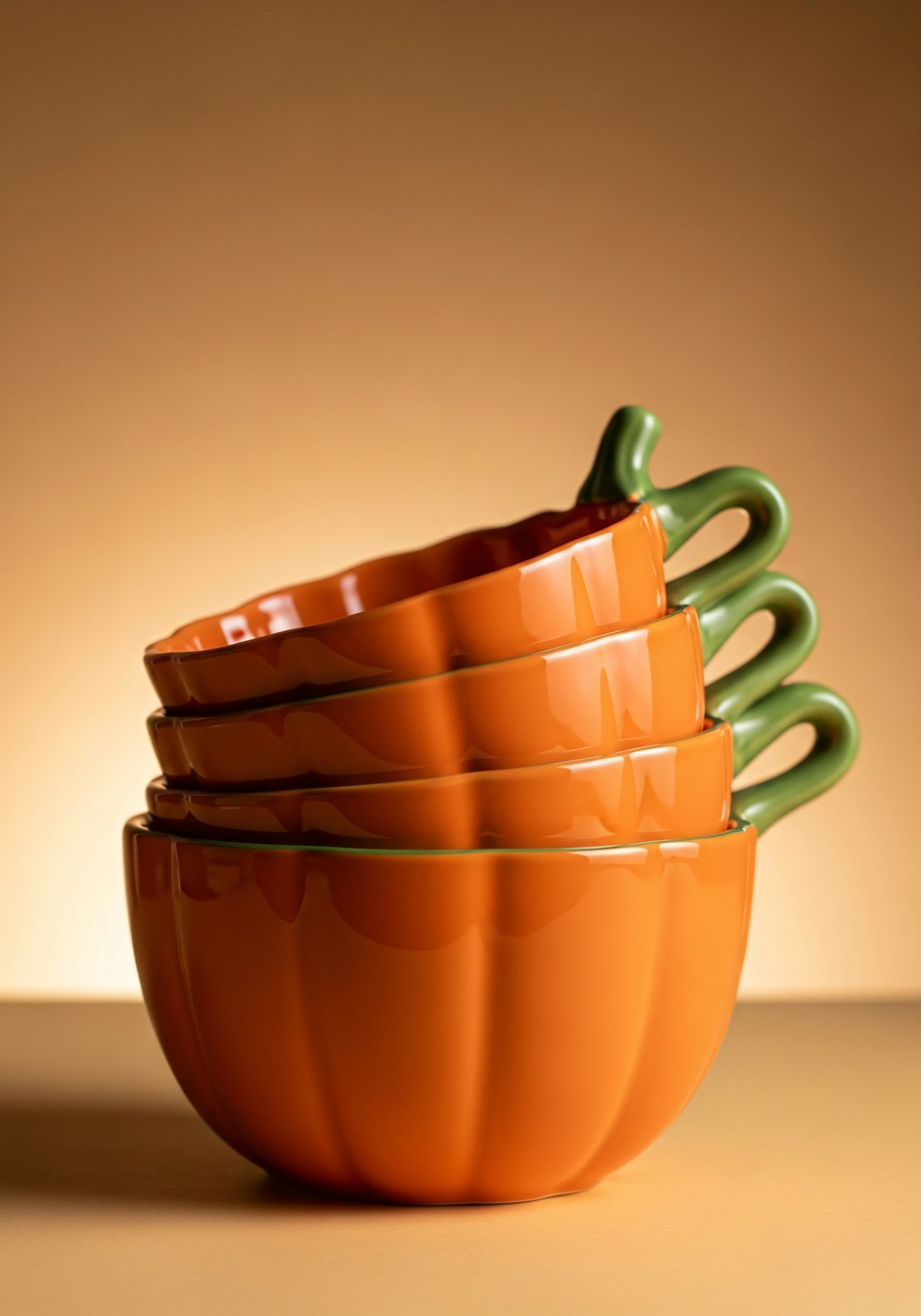 Stacked pumpkin-shaped ceramic mugs with orange bodies and green handles, set against a warm gradient background.