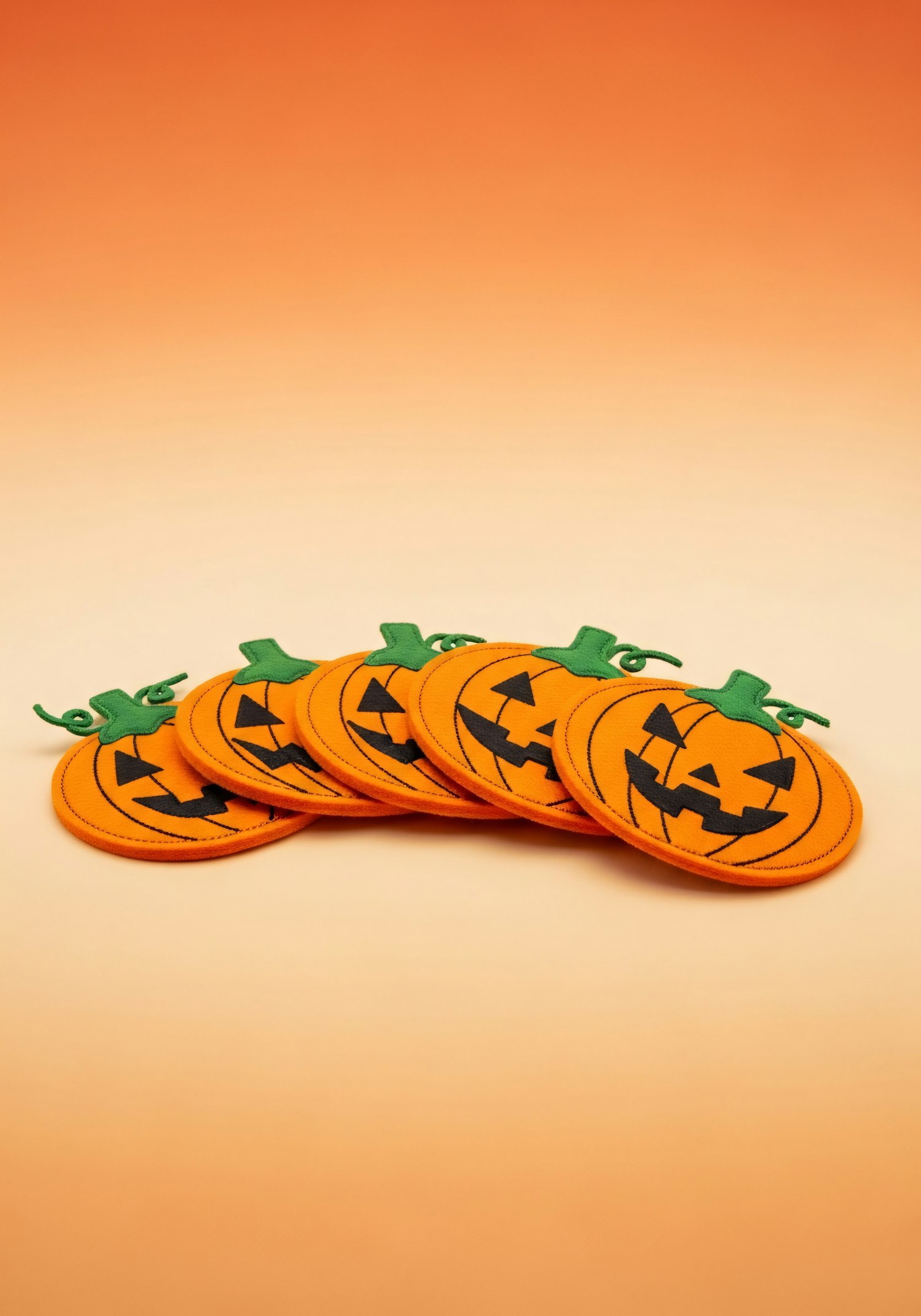 A set of orange pumpkin-shaped coasters with jack-o'-lantern faces, arranged on a gradient orange background, perfect for Halloween decor.