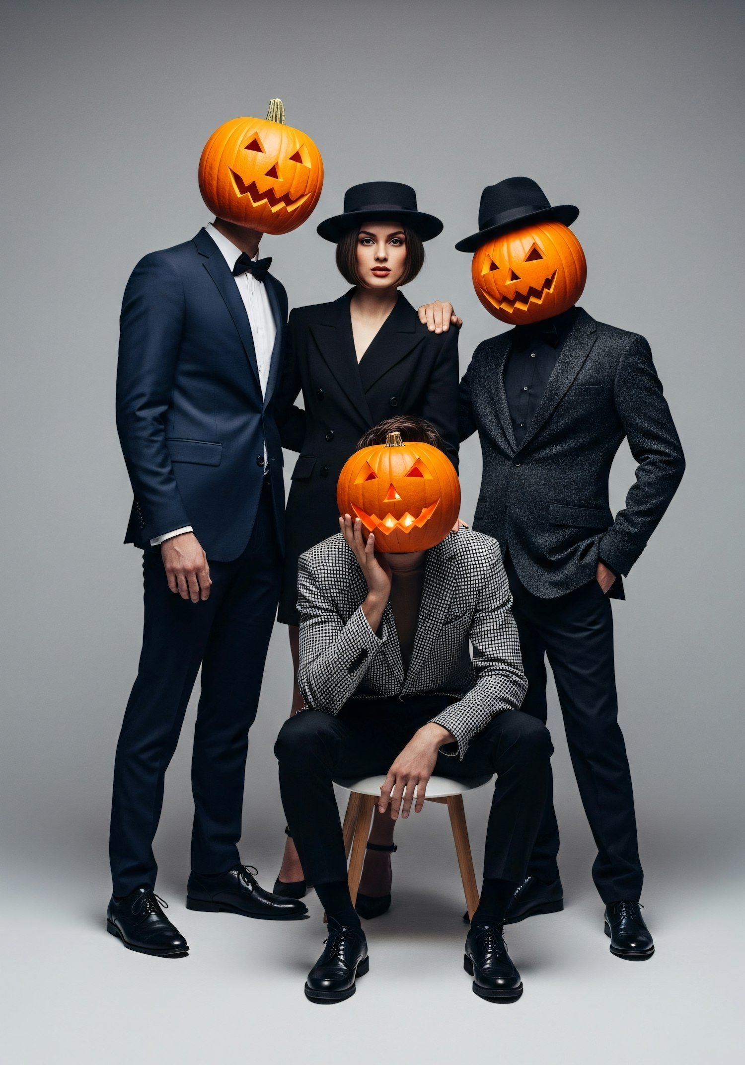 A stylish group in formal attire with jack-o'-lantern heads, blending elegance and Halloween whimsy in a neutral setting.