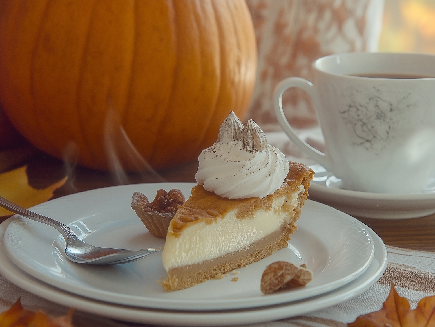 Cozy autumn scene with pumpkin pie, whipped cream, and coffee. Perfect for fall vibes and seasonal treats.