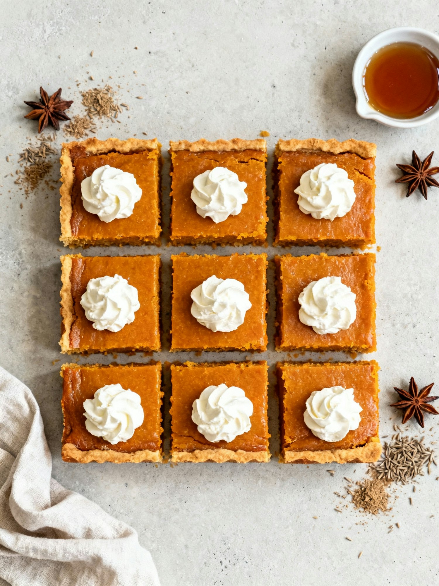 Nine pumpkin pie squares with whipped cream, surrounded by spices and syrup, arranged on a light surface for a cozy dessert vibe.