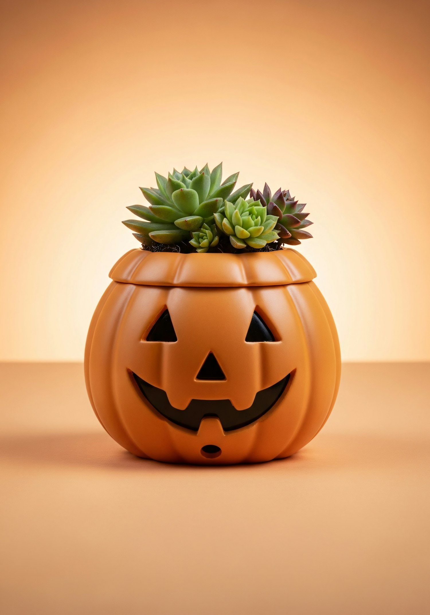 A pumpkin-shaped planter with succulents against a warm orange background, perfect for Halloween or autumn decor.