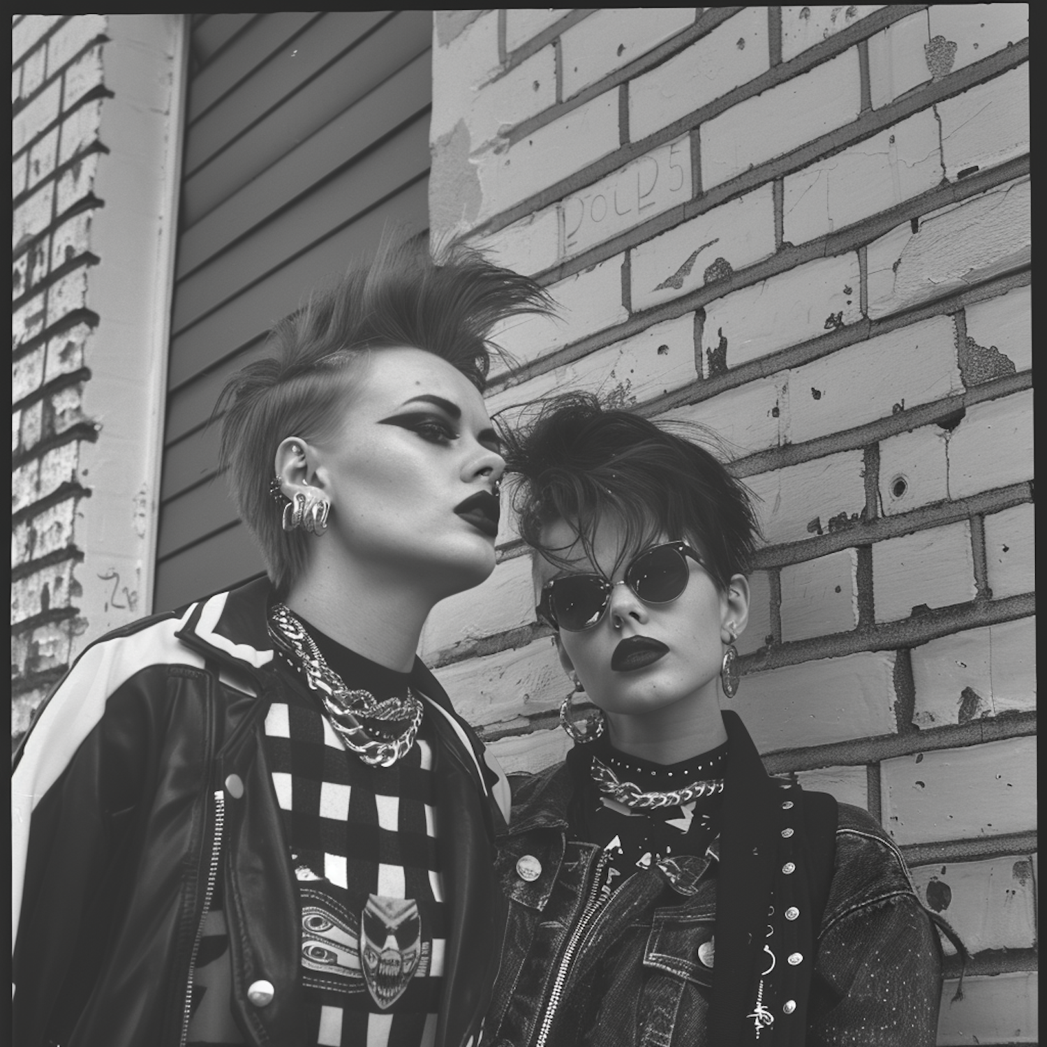 Two punk-styled individuals with bold makeup and edgy outfits pose against a brick wall, exuding a rebellious vibe.