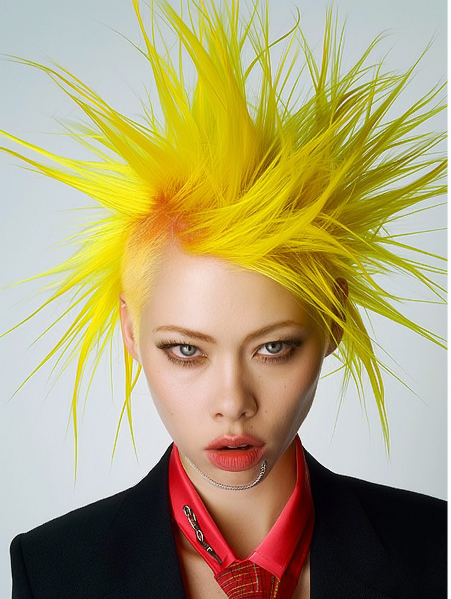 Asian woman with vibrant yellow spiked hair, bold makeup, and edgy fashion style, featuring a black suit and red tie.