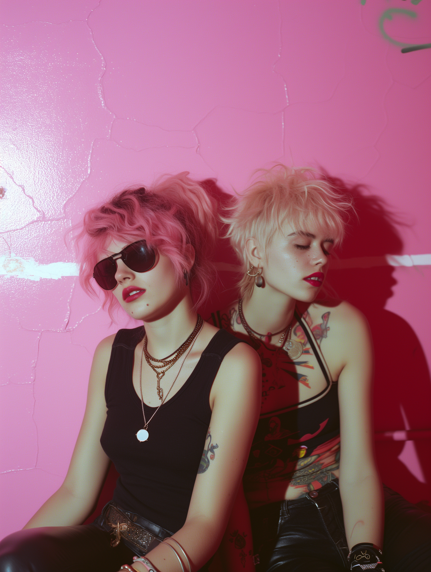Two punk-styled women with vibrant hair and tattoos pose against a pink wall, exuding edgy and rebellious vibes.
