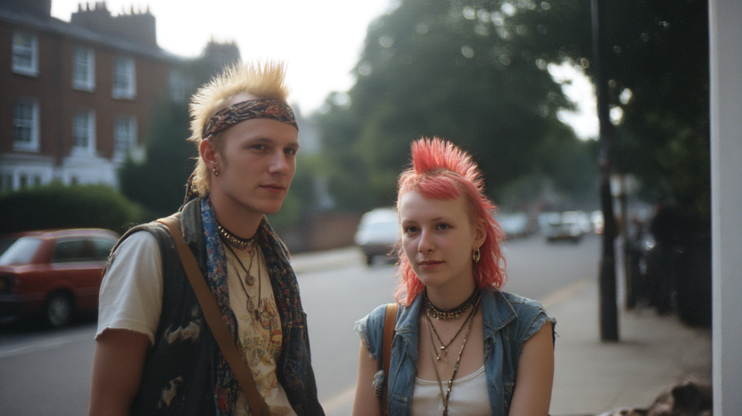 Two punk-styled individuals with spiked hair and layered accessories stand on a street, showcasing bold fashion and unique hairstyles.
