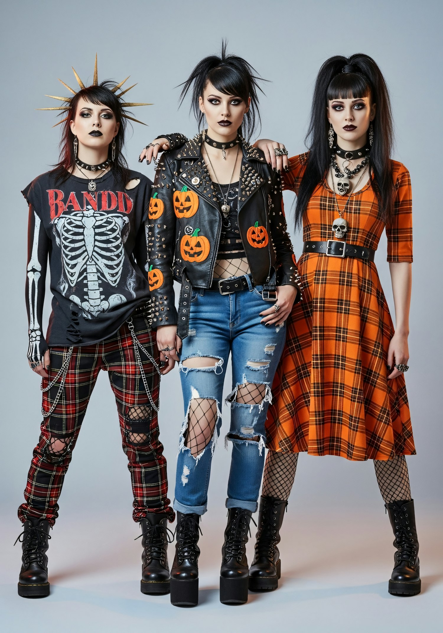 Three individuals in punk-inspired Halloween outfits with bold makeup and accessories, showcasing a gothic and edgy style.