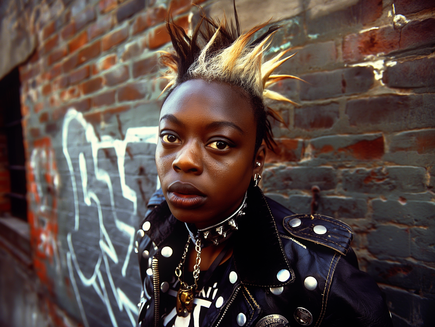 A punk-styled individual with spiked hair and leather jacket stands against a graffiti-covered wall, exuding confidence and style.