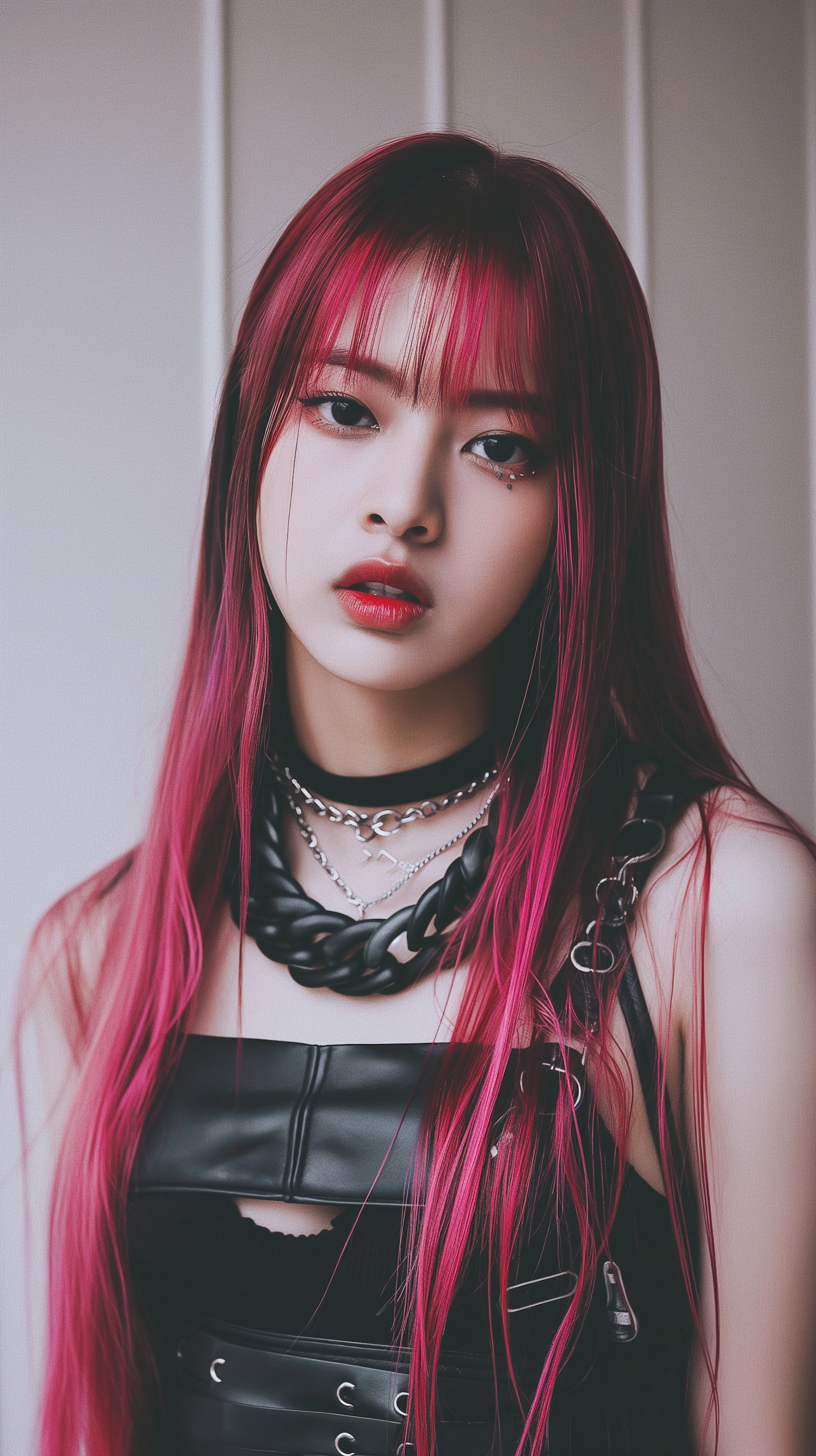 Asian woman with vibrant pink hair, bold makeup, and punk-inspired fashion, featuring leather and metal accessories.