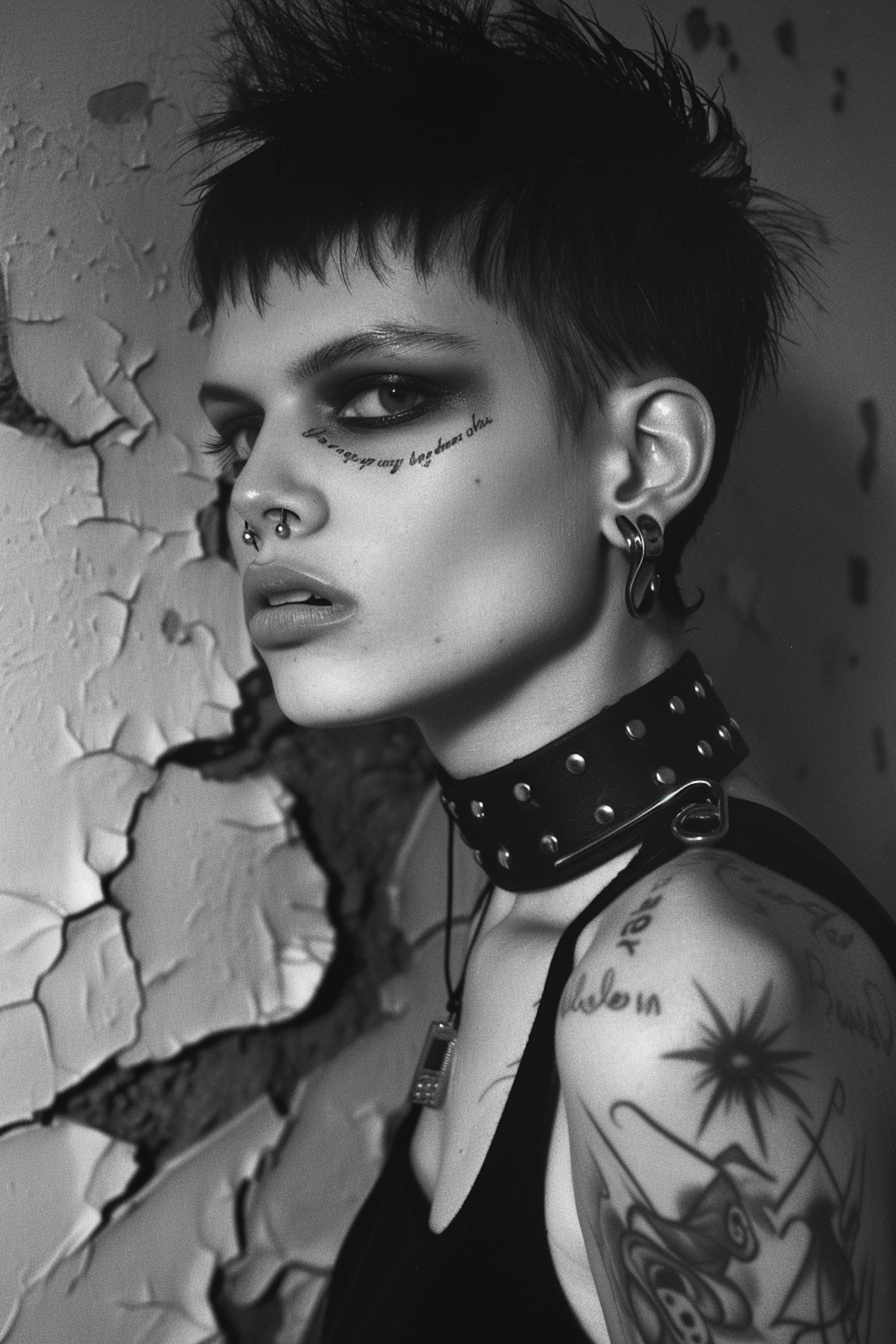 Edgy punk style with spiky hair, piercings, and tattoos against a textured wall. Monochrome aesthetic enhances the rebellious vibe.