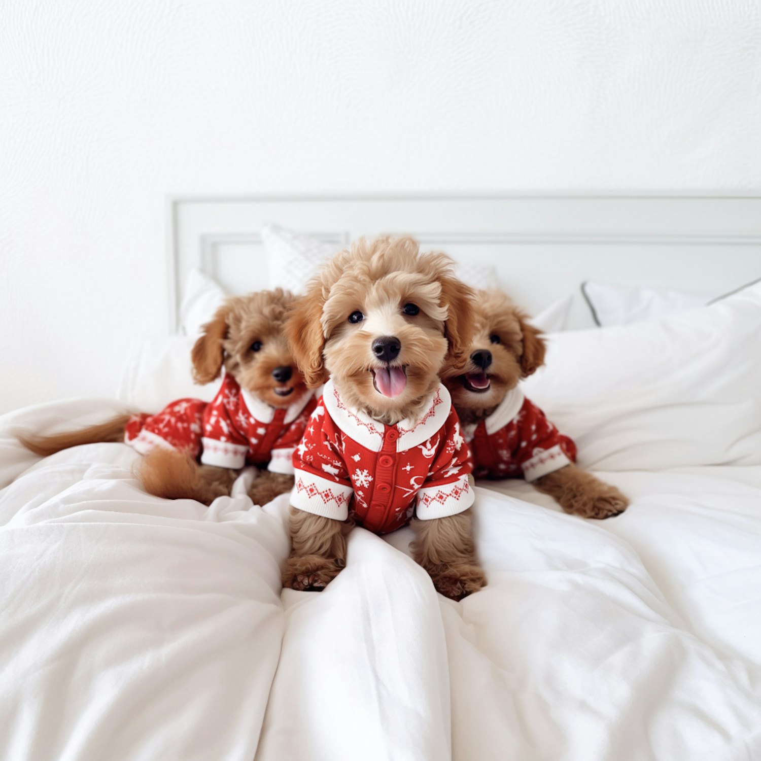 Three fluffy puppies in red holiday sweaters on a white bed, exuding cuteness and festive cheer.