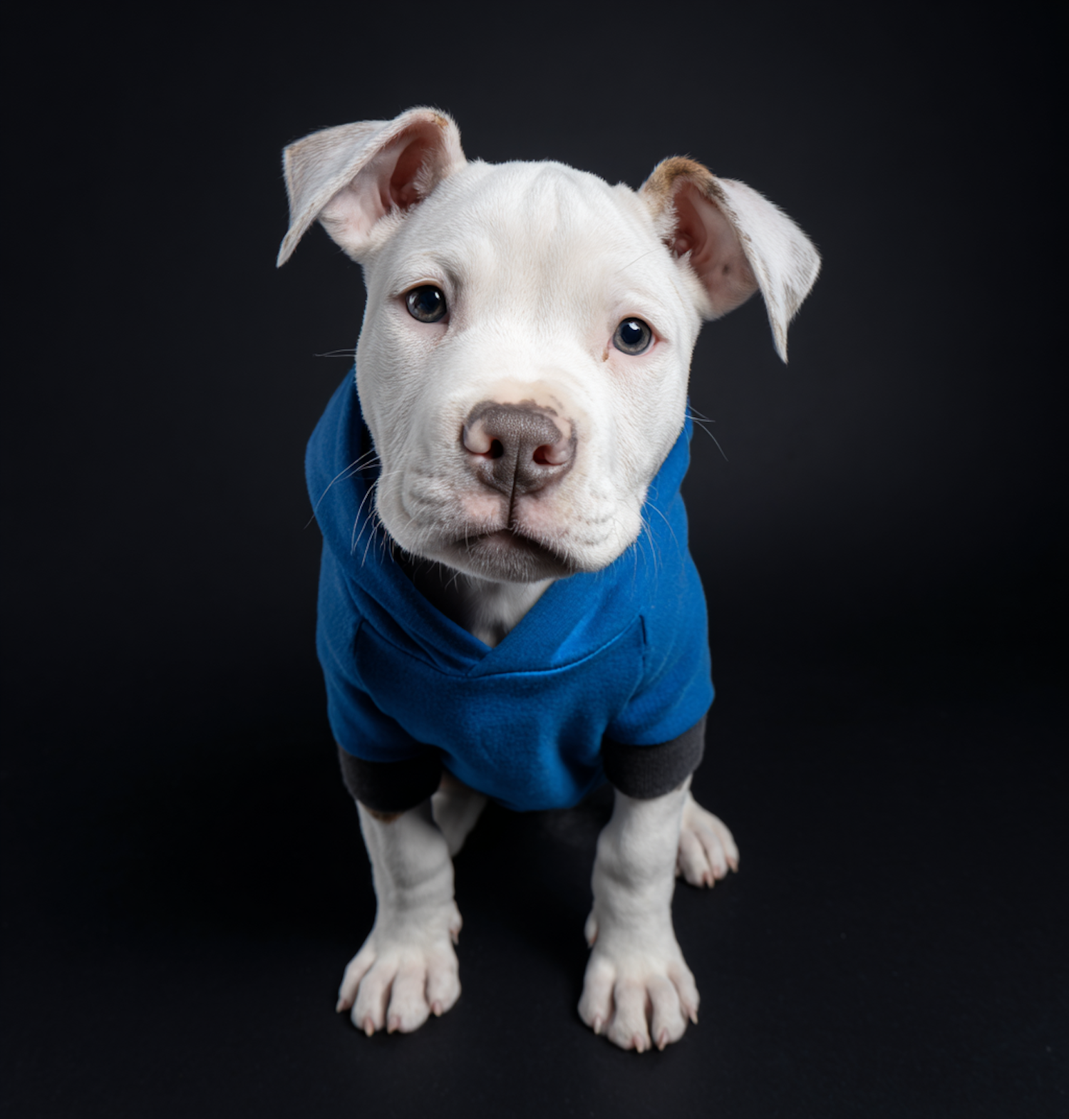 Adorable puppy in a blue hoodie sits against a black background, highlighting its white fur and sweet, curious expression.