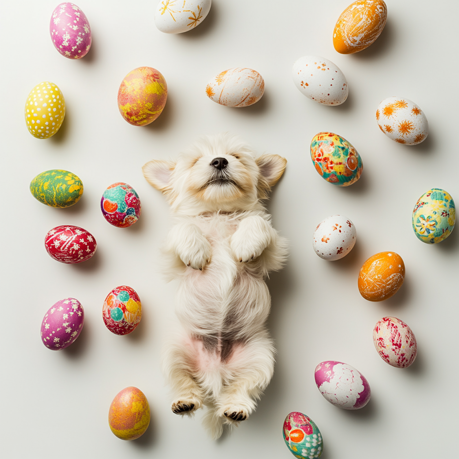 Adorable white puppy lying on its back surrounded by colorful, decorated Easter eggs on a white background. Perfect for festive vibes!