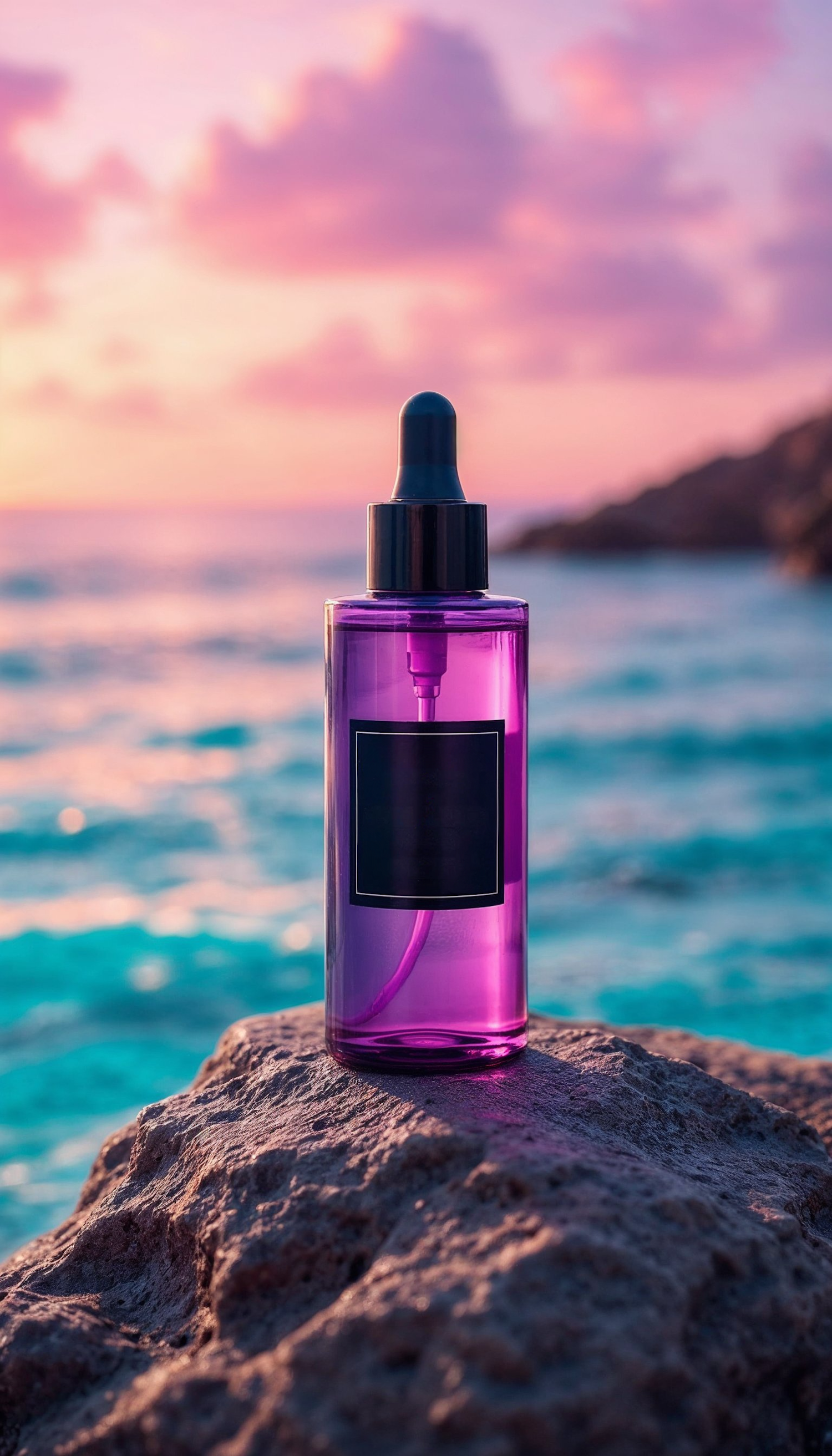 Purple dropper bottle on rocks with ocean and sunset backdrop, creating a serene and vibrant scene.