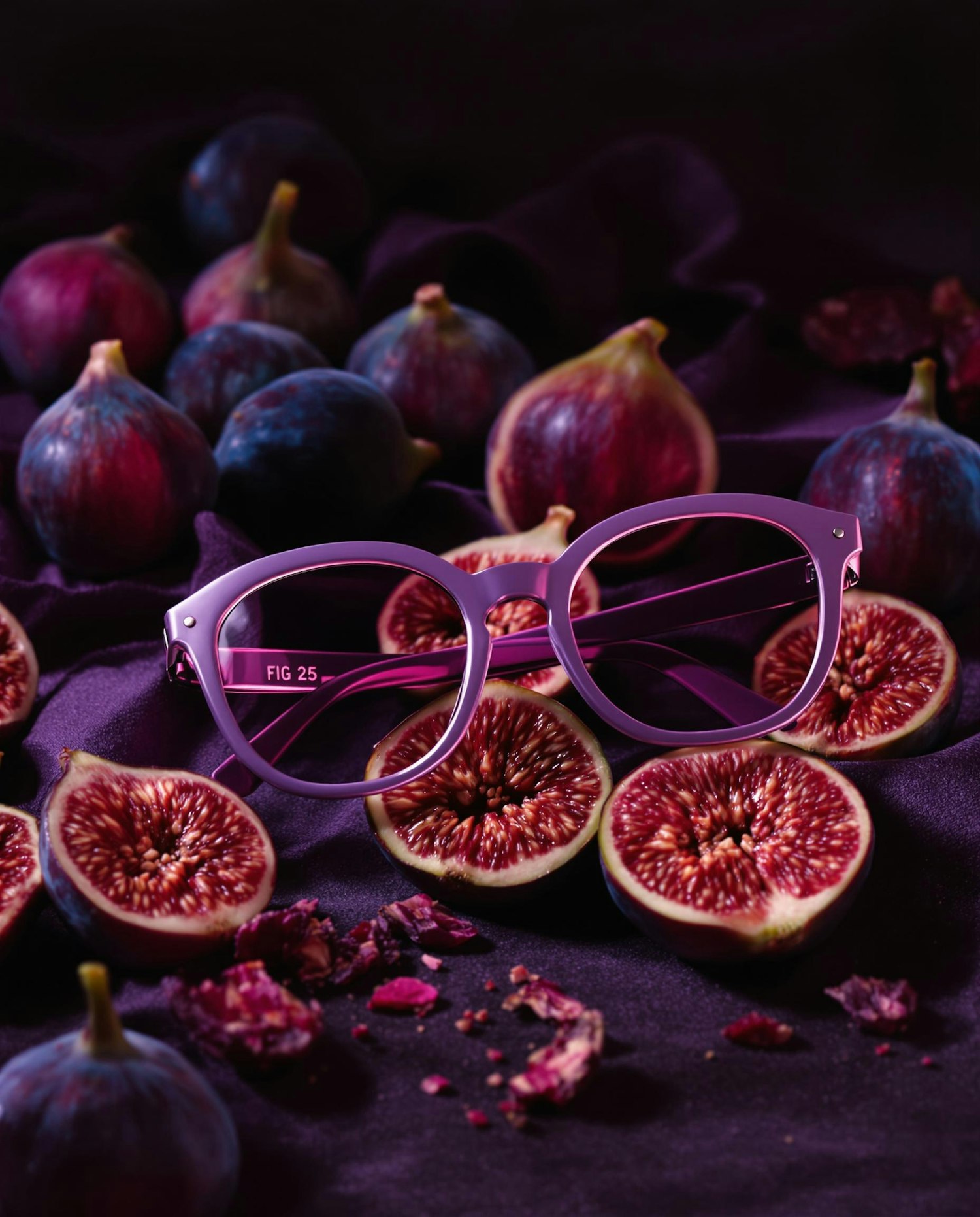Lavender sunglasses placed on an arrangement of figs—some whole, some opened—creating a moody, tactile background in deep purples and warm pinks.