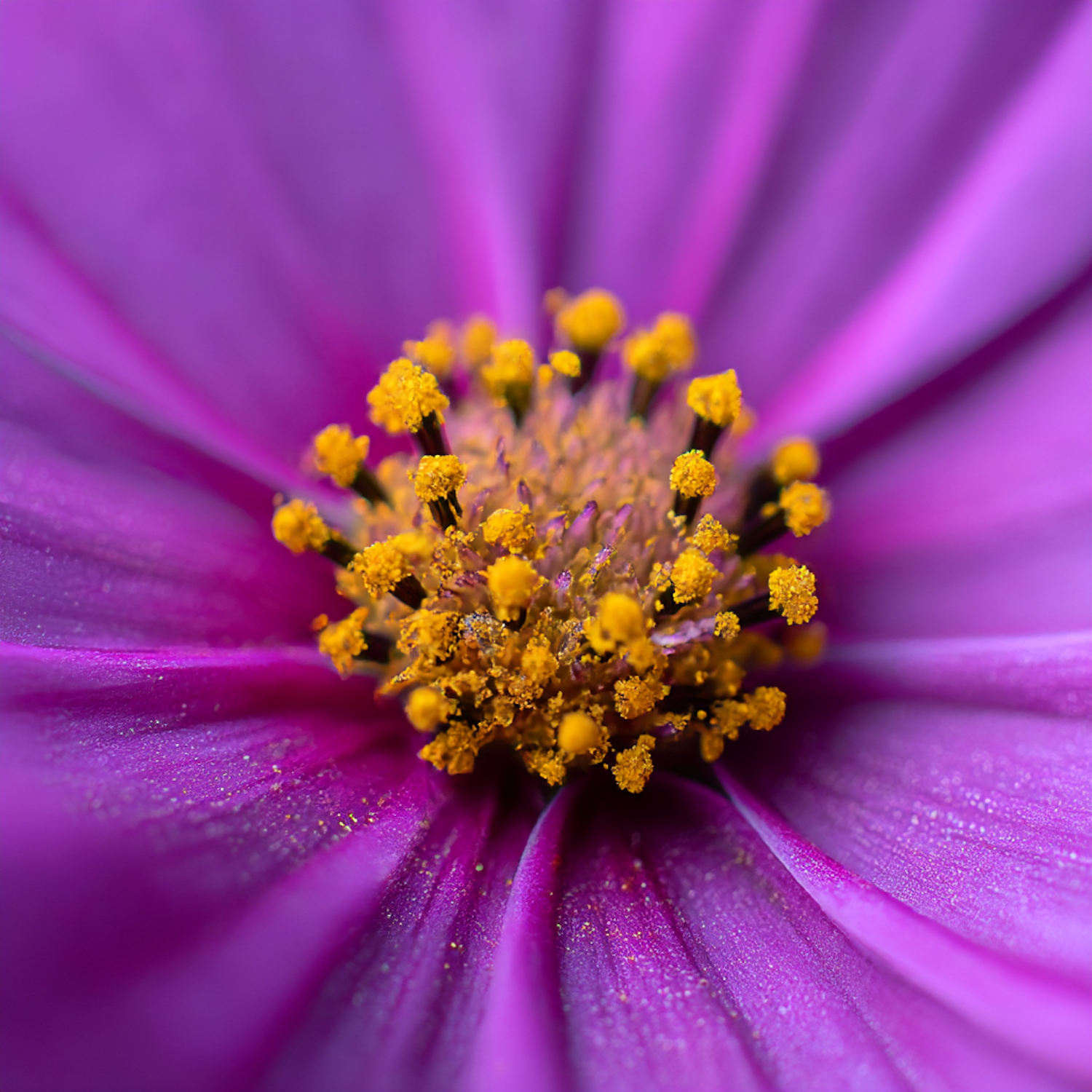 Macro shot of a vibrant purple flower with bright yellow stamens, highlighting intricate details and vivid colors.