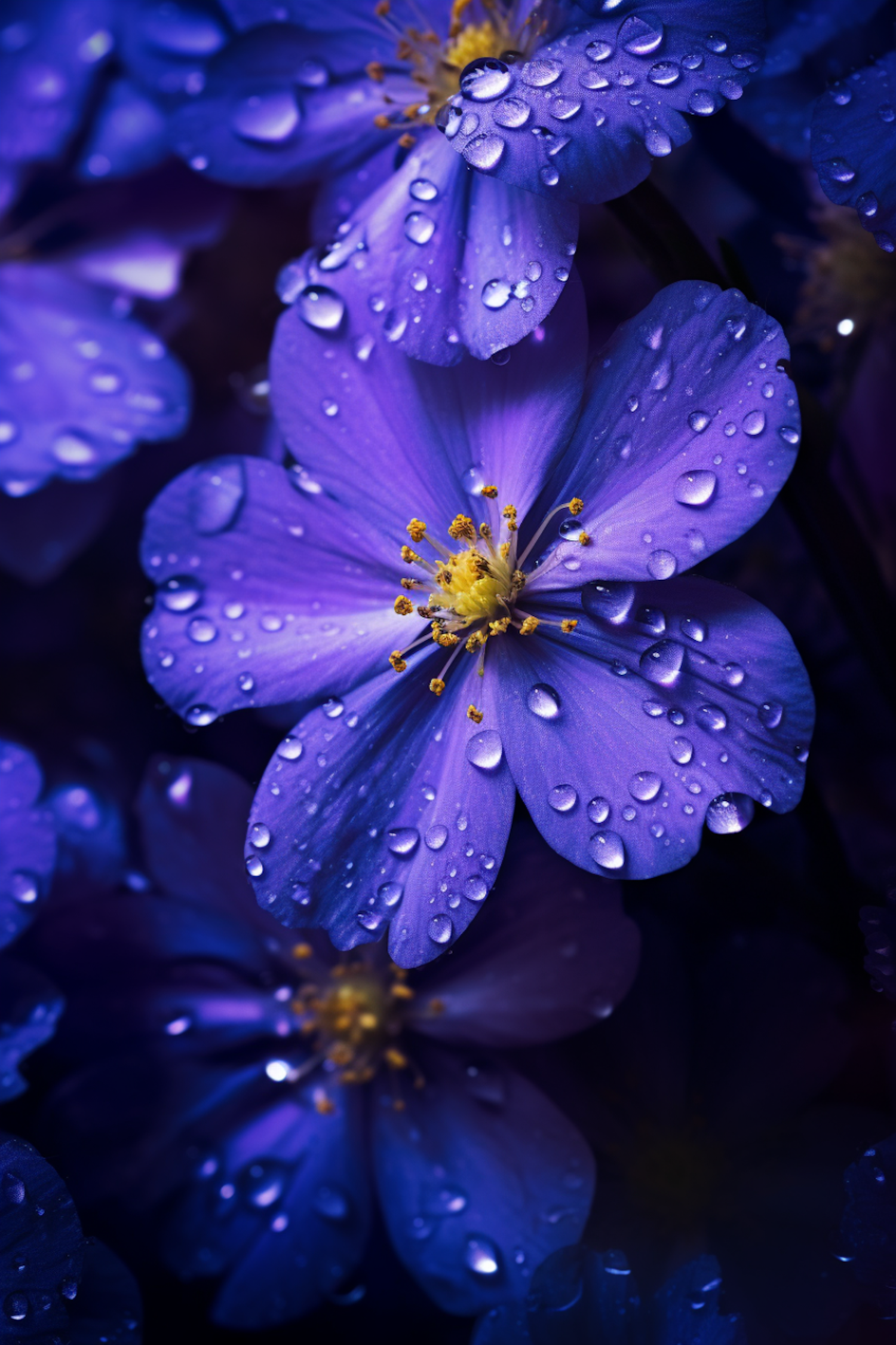 Close-up of vibrant purple flowers with water droplets, highlighting their rich color and fresh appearance.