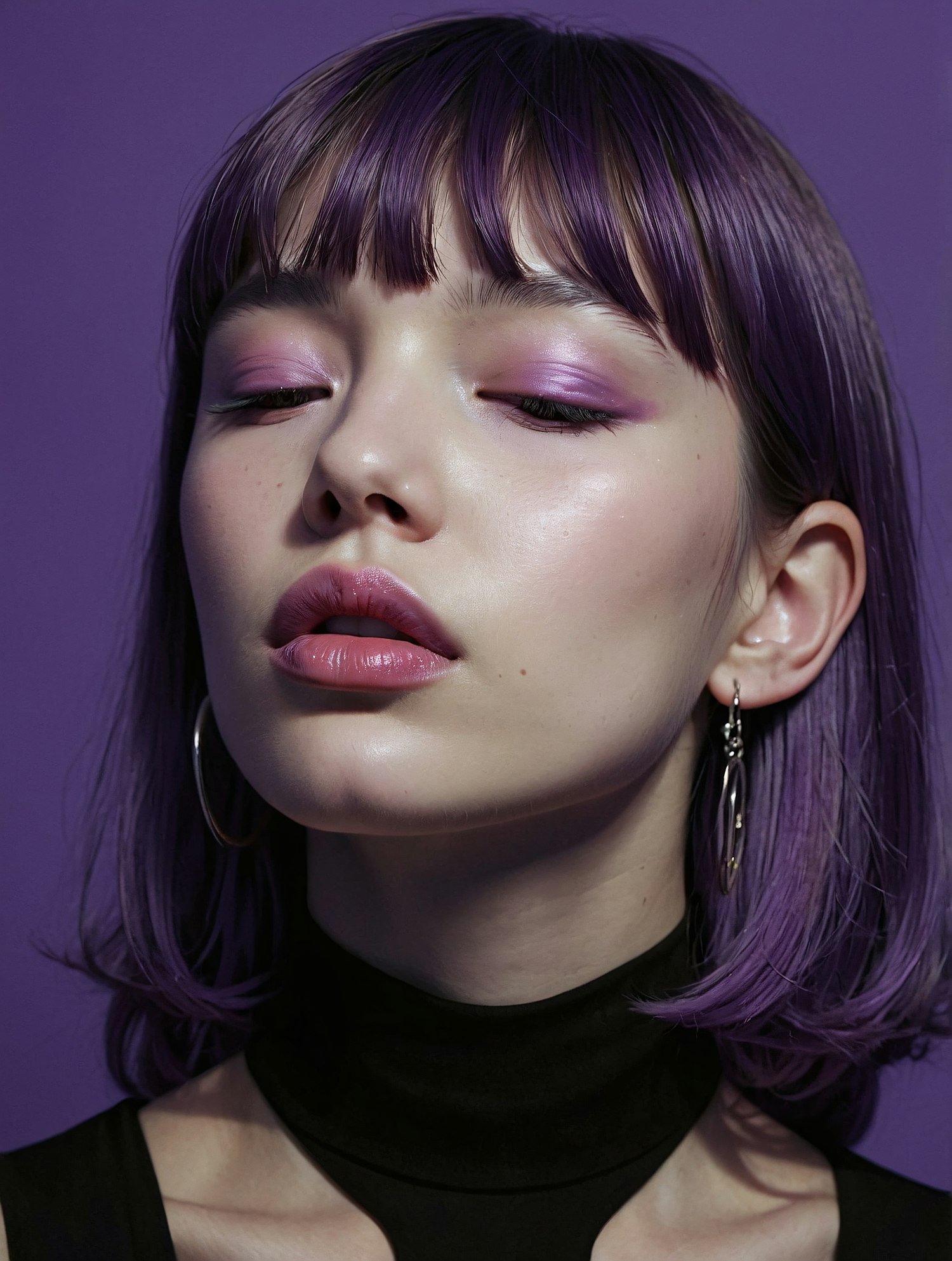 Asian woman with purple hair and makeup, wearing hoop earrings and a black top against a purple background.