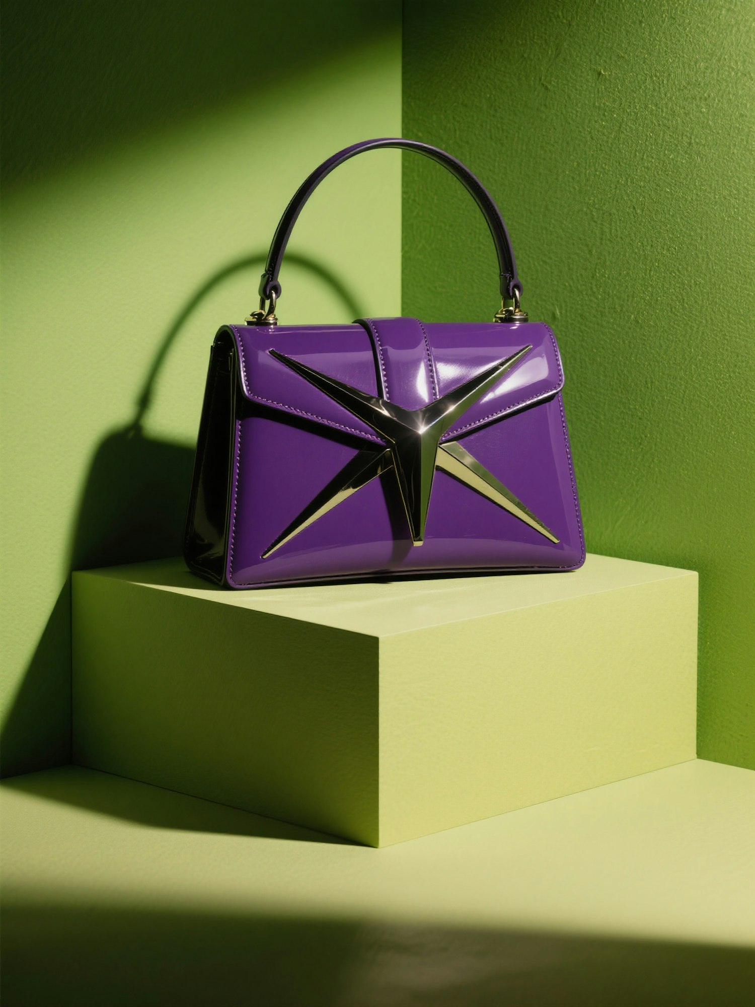 Editorial high-fashion photography, bold and graphic use of colors, minimalist set design, strong studio lighting with high contrast, sharp details, luxury magazine aesthetic, high resolution, avant-garde styling, striking compositions, sophisticated yet audacious mood, luxury still life composition featuring a sculptural Tyrian Purple (#66023C) handbag placed on a minimalist geometric pedestal. The background is a flat Citron green studio wall (#CAD183), perfectly smooth and matte, creating a bold visual contrast with the deep purple tones of the object. The handbag has a glossy lacquer finish with sharp architectural lines, metallic accents in a dark reflective finish, and a structured silhouette. Lighting is dramatic and directional, highlighting the glossy texture of the handbag while casting sculptural shadows on the pedestal and background. The overall composition is graphic, minimal, and powerful, resembling a luxury fashion magazine campaign still life.