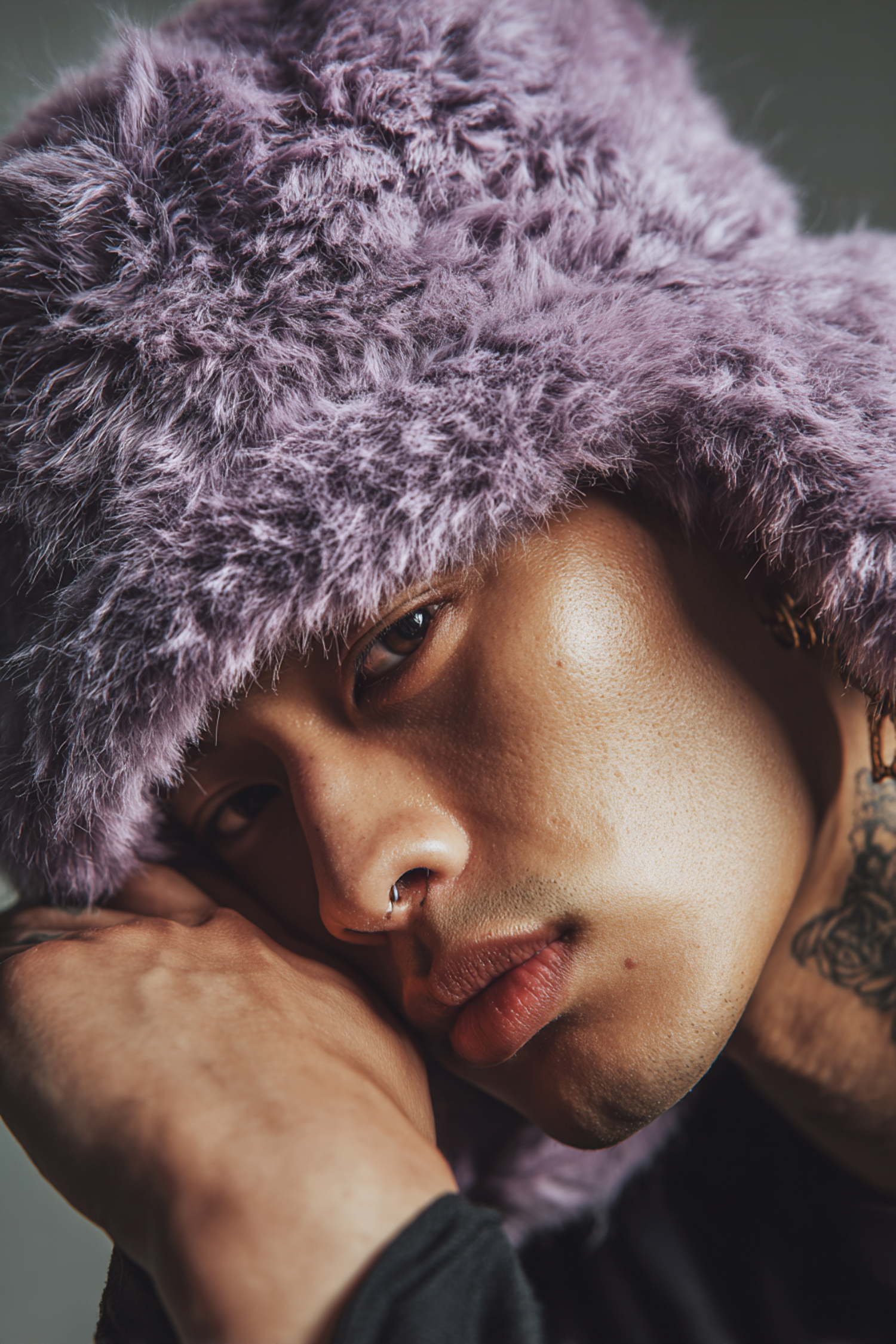 Close-up of a person wearing a purple furry hat, showcasing their calm expression and unique style.