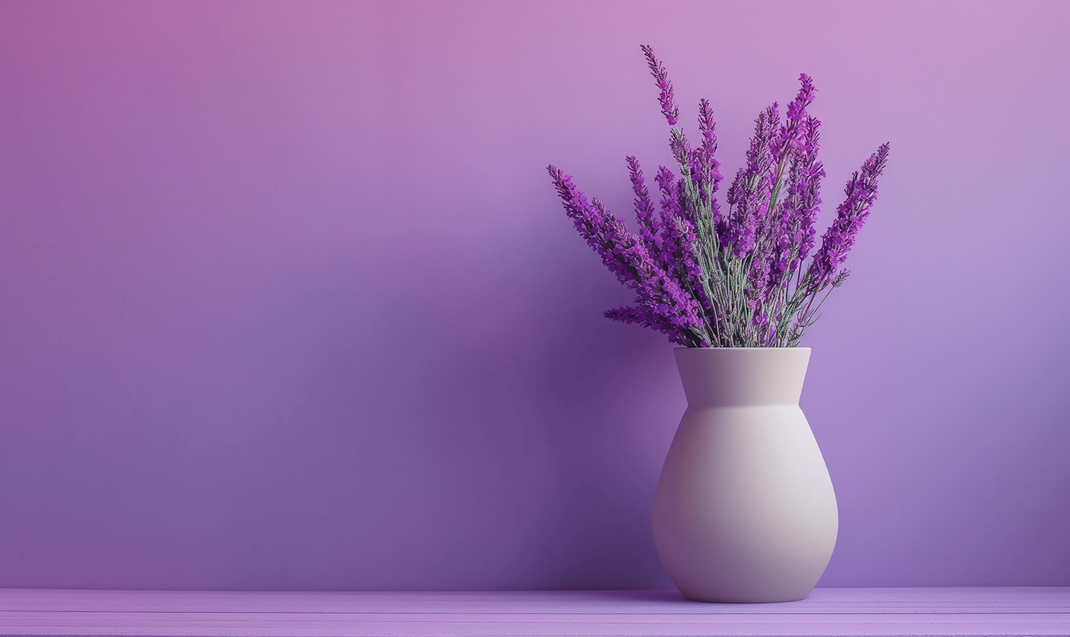 Elegant white vase with vibrant purple lavender flowers against a gradient purple background, creating a calming and minimalist scene.