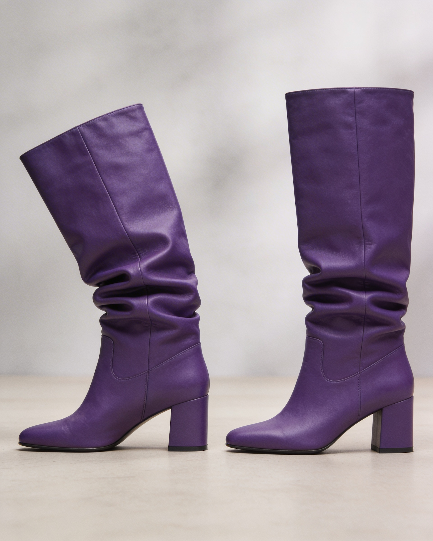 Stylish purple leather boots with a slouchy design and block heels, perfect for making a bold fashion statement.